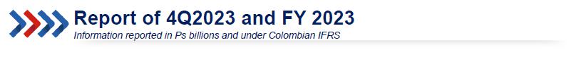 Bogotá, March 4th, 2024. Grupo Aval S.A. (NYSE:AVAL) reported a consolidated attributable net income of Ps 739.0 billion (Ps 31.1 pesos per share) for 2023 versus a Ps 1,888.9 billion figure reported on 2022 on a continued operations basis (Ps 81.6 pesos per share). ROAE was 4.5% and ROAA was 0.7% for 2023.