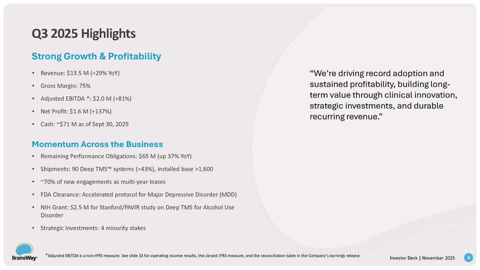 BrainsWay: Global Leader in Transcranial Magnetic Stimulation (TMS) September 16, 2025: FDA Clearance for Accelerated Deep TMS Protocol for MDD Established reimbursement 2013 - Major Depressive Disorder (MDD) 2018 - Obsessive - Compulsive Disorder (OCD) 2020 - Smoking Addiction 2021 - Anxious Depression Installed base of >1,600 systems > 7M individual treatment 4 FDA - cleared indications 3 Investor Deck | November 2025