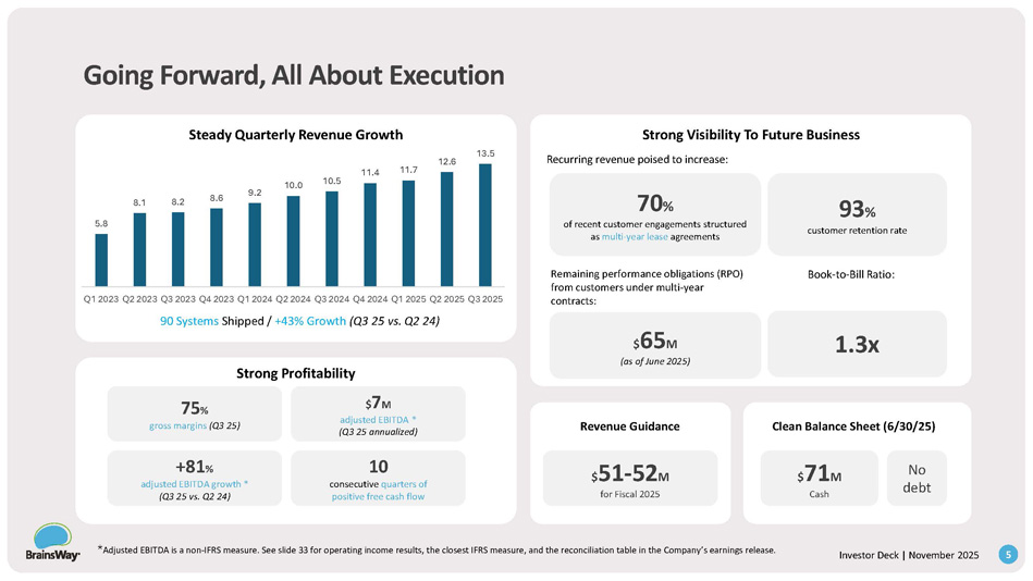 Q3 2025 Highlights Strong Growth & Profitability • Revenue: $13.5 M (+29% YoY) • Gross Margin: 75% • Adjusted EBITDA *: $2.0 M (+81%) • Net Profit: $1.6 M (+137%) • Cash: ~$71 M as of Sept 30, 2025 Momentum Across the Business • Remaining Performance Obligations: $65 M (up 37% YoY) • Shipments: 90 Deep TMS systems (+43%), installed base >1,600 • ~70% of new engagements as multi - year leases • FDA Clearance: Accelerated protocol for Major Depressive Disorder (MDD) • NIH Grant: $2.5 M for Stanford/PAVIR study on Deep TMS for Alcohol Use Disorder • Strategic Investments: 4 minority stakes “We’re driving record adoption and sustained profitability, building long - term value through clinical innovation, strategic investments, and durable recurring revenue.” * Adjusted EBITDA is a non - IFRS measure. See slide 33 for operating income results, the closest IFRS measure, and the reconciliation table in the Company’s earnings release. 4 Investor Deck | November 2025