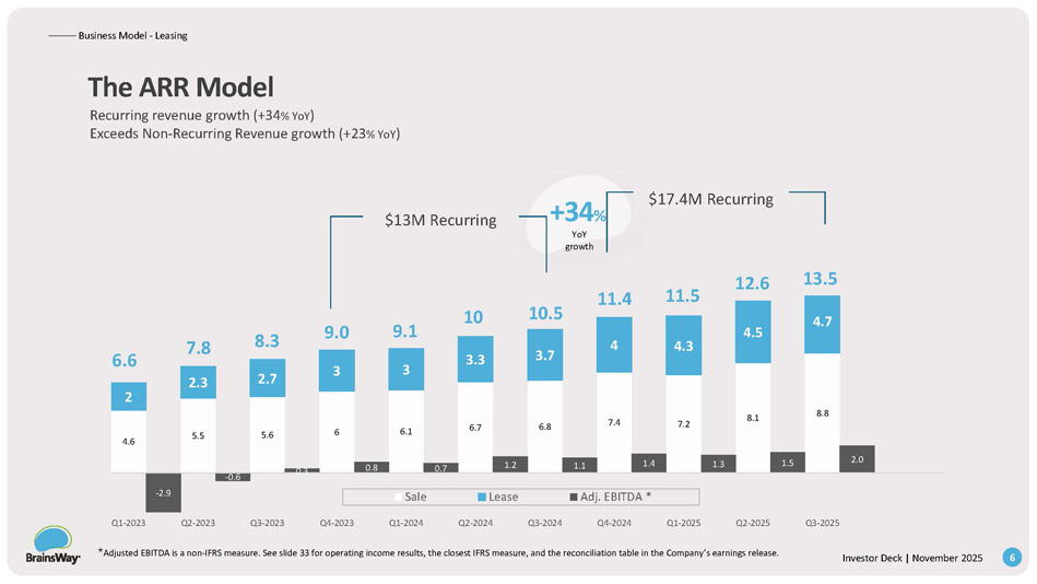 Going Forward, All About Execution Steady Quarterly Revenue Growth 90 Systems Shipped / +43% Growth (Q3 25 vs. Q2 24) Strong Profitability Revenue Guidance Clean Balance Sheet (6/30/25) 75 % gross margins (Q3 25) $ 7 M adjusted EBITDA * (Q3 25 annualized) +81 % adjusted EBITDA growth * (Q3 25 vs. Q2 24) 10 consecutive quarters of positive free cash flow 70 % of recent customer engagements structured as multi - year lease agreements 93 % customer retention rate Strong Visibility To Future Business Recurring revenue poised to increase: Remaining performance obligations (RPO) from customers under multi - year contracts: $ 65 M (as of June 2025) $ 51 - 52 M for Fiscal 2025 Book - to - Bill Ratio: 1.3x $ 71 M Cash No debt 5.8 * Adjusted EBITDA is a non - IFRS measure. See slide 33 for operating income results, the closest IFRS measure, and the reconciliation table in the Company’s earnings release. 5 Investor Deck | November 2025 8.1 8.2 8.6 9.2 10.0 10.5 11.4 11.7 12.6 13.5 Q1 2023 Q2 2023 Q3 2023 Q4 2023 Q1 2024 Q2 2024 Q3 2024 Q4 2024 Q1 2025 Q2 2025 Q3 2025