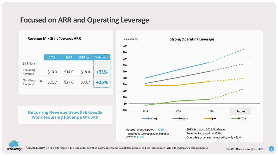 The ARR Model 4.6 5.5 5.6 6 6.1 6.7 6.8 7.4 7.2 8.1 8.8 2 2.3 2.7 3 3 3.3 3.7 4 4.3 4.5 4.7 - 2.9 - 0.6 0.3 0.8 0.7 1.2 1.1 1.4 1.3 1.5 2.0 Q1 - 2023 Q2 - 2023 Q3 - 2023 Q4 - 2023 Q1 - 2024 Q2 - 2024 Q3 - 2024 Q4 - 2024 Q1 - 2025 Q2 - 2025 Q3 - 2025 Sale Lease Adj. EBITDA * ——— — Business Model - Leasing 12.6 11.4 10.5 10 9.1 9.0 8.3 7.8 6.6 $13M Recurring $17.4M Recurring * Adjusted EBITDA is a non - IFRS measure. See slide 33 for operating income results, the closest IFRS measure, and the reconciliation table in the Company’s earnings release. 6 Investor Deck | November 2025 +34 % YoY growth Recurring revenue growth (+34 % YoY ) Exceeds Non - Recurring Revenue growth (+23 % YoY ) 11.5 13.5