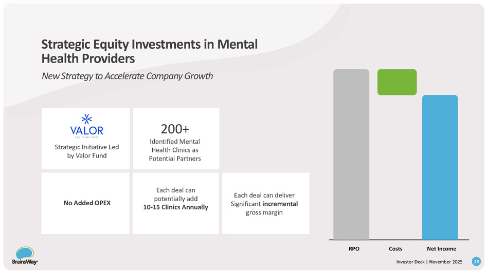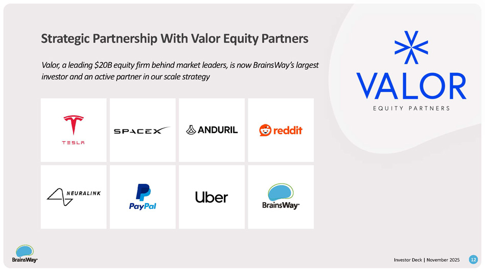 Strategic Partnership With Valor Equity Partners 12 Investor Deck | November 2025 Valor, a leading $20B equity firm behind market leaders, is now BrainsWay’s largest investor and an active partner in our scale strategy