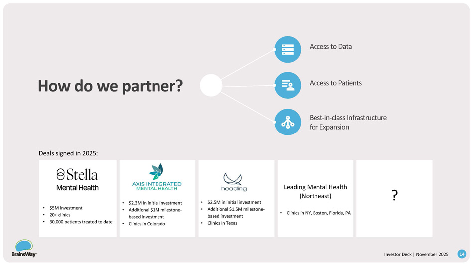 • $5M investment • 20+ clinics • 30,000 patients treated to date • $2.3M in initial investment • Additional $1M milestone - based investment • Clinics in Colorado • $2.5M in initial investment • Additional $1.5M milestone - based investment • Clinics in Texas Leading Mental Health (Northeast) • Clinics in NY, Boston, Florida, PA ? How do we partner? Deals signed in 2025 : 14 Investor Deck | November 2025 Access to Data Access to Patients Best - in - class Infrastructure for Expansion