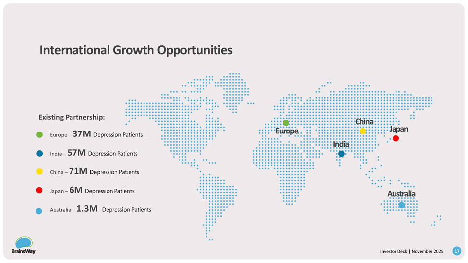 Europe – 37M Depression Patients India – 57M Depression Patients China – 71M Depression Patients Japan – 6M Depression Patients Australia – 1.3M Depression Patients Existing Partnership: Europ e India China Australia Japan International Growth Opportunities 17 Investor Deck | November 2025