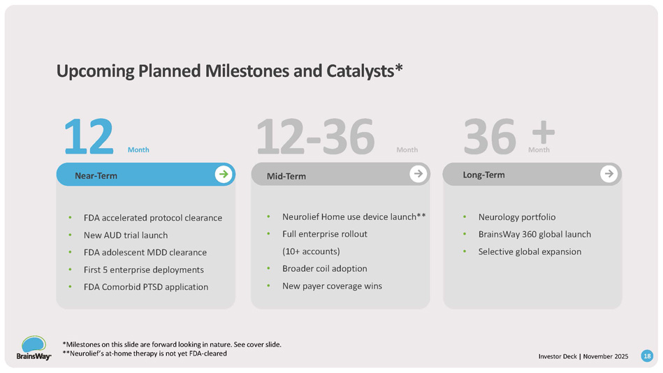 Investor Deck | November 2025 Upcoming Planned Milestones and Catalysts* • Neurolief Home use device launch** • Full enterprise rollout (10+ accounts) • Broader coil adoption • New payer coverage wins Long - Term • Neurology portfolio • BrainsWay 360 global launch • Selective global expansion Near - Term Mid - Term • FDA accelerated protocol clearance • New AUD trial launch • FDA adolescent MDD clearance • First 5 enterprise deployments • FDA Comorbid PTSD application Month 12 12 - 36 36 Month M + o n th 18 *Milestones on this slide are forward looking in nature. See cover slide. **Neurolief’s at - home therapy is not yet FDA - cleared