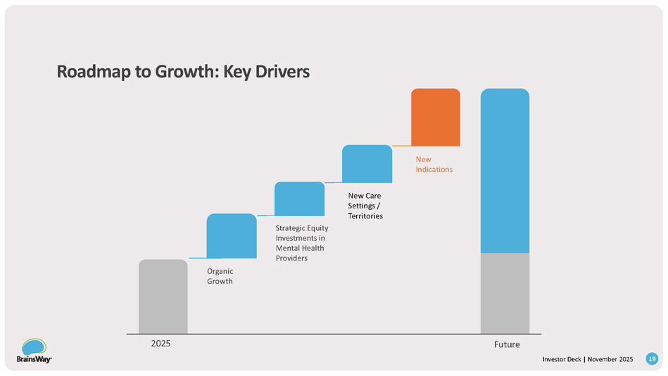 Roadmap to Growth: Key Drivers New Indications New Care Settings / Territories Strategic Equity Investments in Mental Health Providers Organic Growth 2025 Future 9 Investor Deck | November 2025
