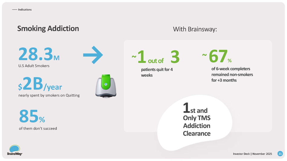 — — Indications Smoking Addiction 28.3 M U.S Adult Smokers $ 2B /year nearly spent by smokers on Quitting 85 % of them don't succeed With Brainsway: ~ 67 % of 6 - week completers remained non - smokers for +3 months ~ 1 o u t of 3 patients quit for 4 weeks 1 st and Only TMS Addiction Clearance 21 Investor Deck | November 2025
