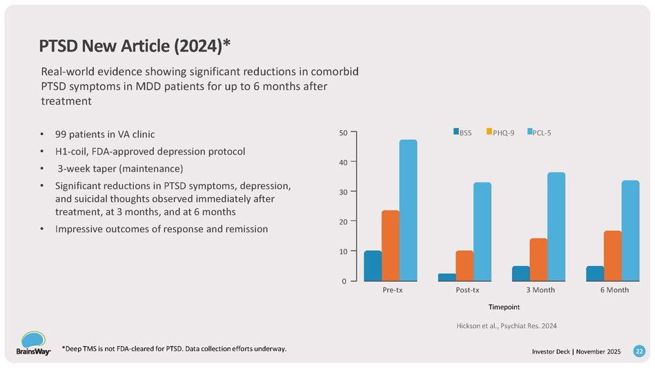 Pre - tx Post - tx 3 Month 6 Month 20 10 0 40 30 50 BSS *Deep TMS is not FDA - cleared for PTSD. Data collection efforts underway. 22 Investor Deck | November 2025 PHQ - 9 PCL - 5 PTSD New Article (2024)* Real - world evidence showing significant reductions in comorbid PTSD symptoms in MDD patients for up to 6 months after treatment • 99 patients in VA clinic • H1 - coil, FDA - approved depression protocol • 3 - week taper (maintenance) • Significant reductions in PTSD symptoms, depression, and suicidal thoughts observed immediately after treatment, at 3 months, and at 6 months • Impressive outcomes of response and remission Timepoint Hickson et al., Psychiat Res. 2024