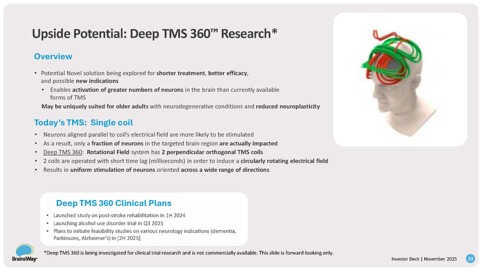 Investor Deck | November 2025 Upside Potential: Deep TMS 360 Research* Overview • Potential Novel solution being explored for shorter treatment , better efficacy , and possible new indications • Enables activation of greater numbers of neurons in the brain than currently available forms of TMS May be uniquely suited for older adults with neurodegenerative conditions and reduced neuroplasticity Today’s TMS: Single coil • Neurons aligned parallel to coil’s electrical field are more likely to be stimulated • As a result, only a fraction of neurons in the targeted brain region are actually impacted • Deep TMS 360 : Rotational Field system has 2 perpendicular orthogonal TMS coils • 2 coils are operated with short time lag (milliseconds) in order to induce a circularly rotating electrical field • Results in uniform stimulation of neurons oriented across a wide range of directions 23 Deep TMS 360 Clinical Plans • Launched study on post - stroke rehabilitation in 1H 2024 • Launching alcohol use disorder trial in Q3 2025 • Plans to initiate feasibility studies on various neurology indications (dementia, Parkinsons, Alzheimer's) in [2H 2025] *Deep TMS 360 is being investigated for clinical trial research and is not commercially available. This slide is forward - looking only.