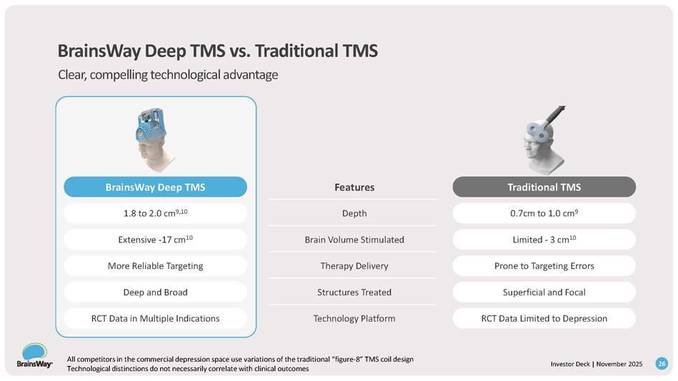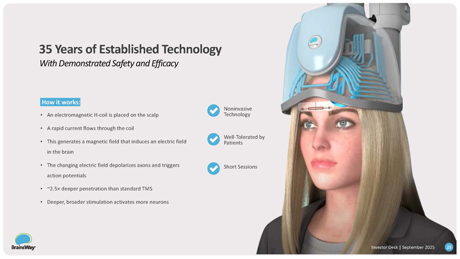 How it works: • An electromagnetic H - coil is placed on the scalp • A rapid current flows through the coil • This generates a magnetic field that induces an electric field in the brain • The changing electric field depolarizes axons and triggers action potentials • ~2.5 п deeper penetration than standard TMS • Deeper, broader stimulation activates more neurons Noninvasive Technology Well - Tolerated by Patients Short Sessions 35 Years of Established Technology With Demonstrated Safety and Efficacy Investor Deck | November 2025 Investor Deck | September 2025 25