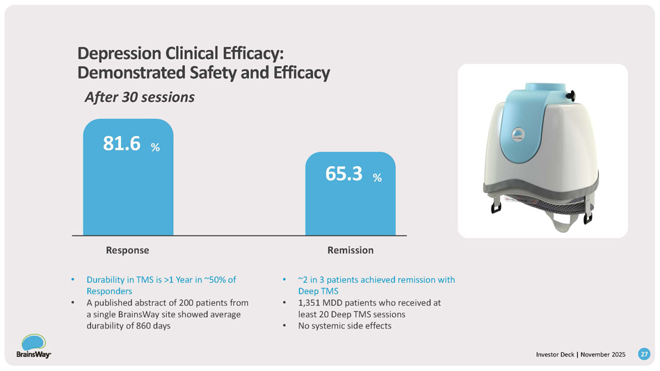 Investor Deck | November 2025 All competitors in the commercial depression space use variations of the traditional “figure - 8” TMS coil design Technological distinctions do not necessarily correlate with clinical outcomes BrainsWay Deep TMS Traditional TMS 1.8 to 2.0 cm 9,10 Extensive - 17 cm 10 More Reliable Targeting Deep and Broad RCT Data in Multiple Indications 0.7cm to 1.0 cm 9 Limited - 3 cm 10 Prone to Targeting Errors Superficial and Focal RCT Data Limited to Depression Features Depth Brain Volume Stimulated Therapy Delivery Structures Treated Technology Platform BrainsWay Deep TMS vs. Traditional TMS Clear, compelling technological advantage 26