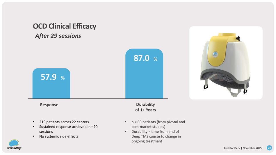 Depression Clinical Efficacy: Demonstrated Safety and Efficacy After 30 sessions 81.6 % Remission 65.3 % Response • Durability in TMS is >1 Year in ~50% of Responders • A published abstract of 200 patients from a single BrainsWay site showed average durability of 860 days • ~2 in 3 patients achieved remission with Deep TMS • 1,351 MDD patients who received at least 20 Deep TMS sessions • No systemic side effects 27 Investor Deck | November 2025