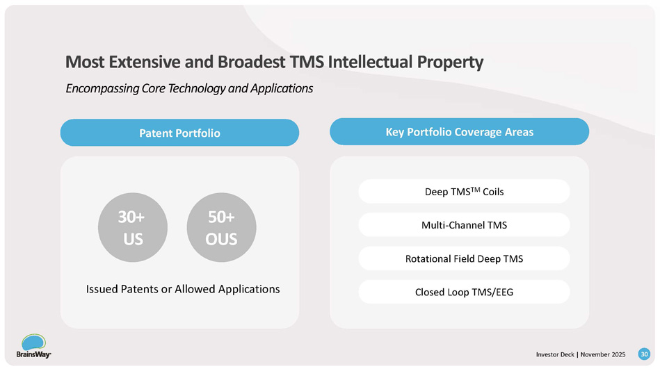 30+ US 50+ OUS Deep TMS TM Coils Multi - Channel TMS Rotational Field Deep TMS Closed Loop TMS/EEG Issued Patents or Allowed Applications Most Extensive and Broadest TMS Intellectual Property Encompassing Core Technology and Applications Key Portfolio Coverage Areas Patent Portfolio 30 Investor Deck | November 2025