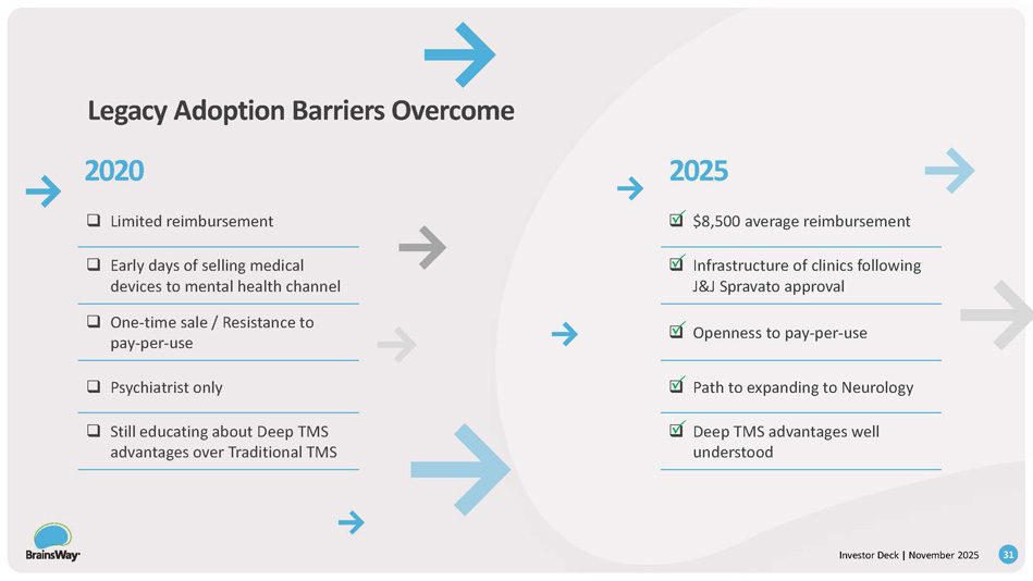 2020 2025 Legacy Adoption Barriers Overcome □  $8,500 average reimbursement □ Limited reimbursement □  Infrastructure of clinics following J&J Spravato approval □ Early days of selling medical devices to mental health channel □  Openness to pay - per - use □ One - time sale / Resistance to pay - per - use □  Path to expanding to Neurology □ Psychiatrist only □  Deep TMS advantages well understood □ Still educating about Deep TMS advantages over Traditional TMS 31 Investor Deck | November 2025