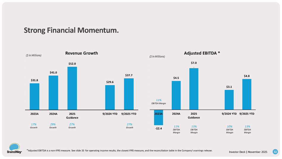Investor Deck | November 2025 Strong Financial Momentum. $31.8 $41.0 $52.0 $29.6 $37.7 $0. 00 $10 .00 $20 .00 $30 .00 $40 .00 $50 .00 $60 .00 2023A 2024A 2025 Guidance 9/2024 YTD 9/2025 YTD Revenue Growth - $2.4 $4.5 $7.0 $3.1 $4.8 - $3.00 - $2.00 - $1.00 $0. 00 $1. 00 $2. 00 $3. 00 $4. 00 $5. 00 $6. 00 $7. 00 2023A 2024A 2025 Guidance 9/2024 YTD 9/2025 YTD Adjusted EBITDA * ($ in Millions) ($ in Millions) 27% Growth 27% Growth 29% Growth 17% Growth 13% EBITDA Margin 10% EBITDA Margin 13% EBITDA Margin 11% EBITDA Margin 11% EBITDA Margin 32 * Adjusted EBITDA is a non - IFRS measure. See slide 33 for operating income results, the closest IFRS measure, and the reconciliation table in the Company’s earnings release.