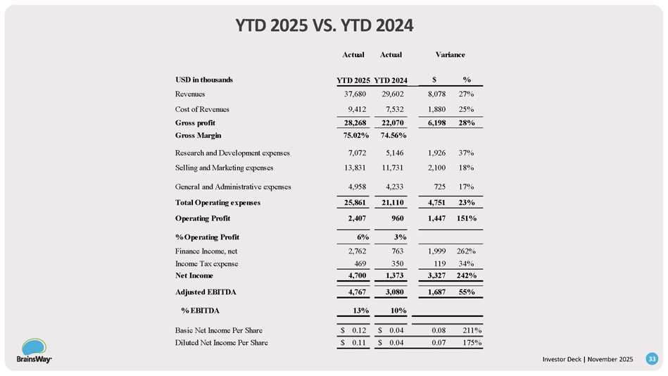 YTD 2025 VS. YTD 2024 Variance Actual Actual % $ YTD 2024 YTD 2025 USD in thousands 27% 8,078 29,602 37,680 Revenues 25% 1,880 7,532 9,412 Cost of Revenues 28% 6,198 22,070 28,268 Gross profit 74.56% 75.02% Gross Margin 37% 1,926 5,146 7,072 Research and Development expenses 18% 2,100 11,731 13,831 Selling and Marketing expenses 17% 725 4,233 4,958 General and Administrative expenses 23% 4,751 21,110 25,861 Total Operating expenses 151% 1,447 960 2,407 Operating Profit 3% 6% % Operating Profit 262% 1,999 763 2,762 Finance Income, net 34% 119 350 469 Income Tax expense 242% 3,327 1,373 4,700 Net Income 55% 1,687 3,080 4,767 Adjusted EBITDA 10% 13% % EBITDA 211% 0.08 $ 0.04 $ 0.12 Basic Net Income Per Share 175% 0.07 $ 0.04 $ 0.11 Diluted Net Income Per Share Investor Deck | November 2025 33