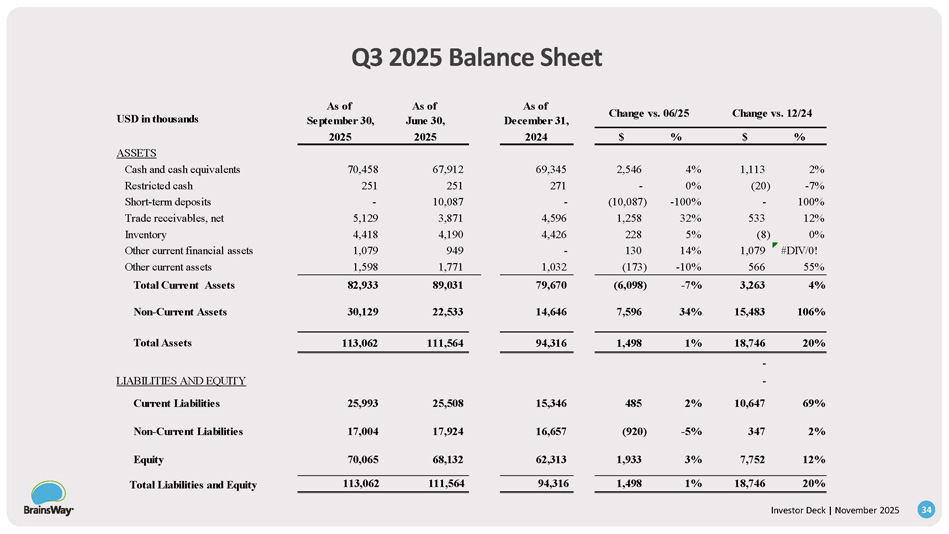 Q3 2025 Balance Sheet Change vs. 06/25 Change vs. 12/24 As of December 31, As of June 30, As of September 30, USD in thousands % $ % $ 2024 2025 2025 ASSETS 2% 1,113 4% 2,546 69,345 67,912 70,458 Cash and cash equivalents - 7% (20) 0% - 271 251 251 Restricted cash 100% - - 100% (10,087) - 10,087 - Short - term deposits 12% 533 32% 1,258 4,596 3,871 5,129 Trade receivables, net 0% (8) 5% 228 4,426 4,190 4,418 Inventory #DIV/0! 1,079 14% 130 - 949 1,079 Other current financial assets 55% 566 - 10% (173) 1,032 1,771 1,598 Other current assets 4% 3,263 - 7% (6,098) 79,670 89,031 82,933 Total Current Assets 106% 15,483 34% 7,596 14,646 22,533 30,129 Non - Current Assets 20% 18,746 1% 1,498 94,316 111,564 113,062 Total Assets - - LIABILITIES AND EQUITY 69% 10,647 2% 485 15,346 25,508 25,993 Current Liabilities 2% 347 - 5% (920) 16,657 17,924 17,004 Non - Current Liabilities 12% 7,752 3% 1,933 62,313 68,132 70,065 Equity 20% 18,746 1% 1,498 94,316 111,564 113,062 Total Liabilities and Equity Investor Deck | November 2025 34