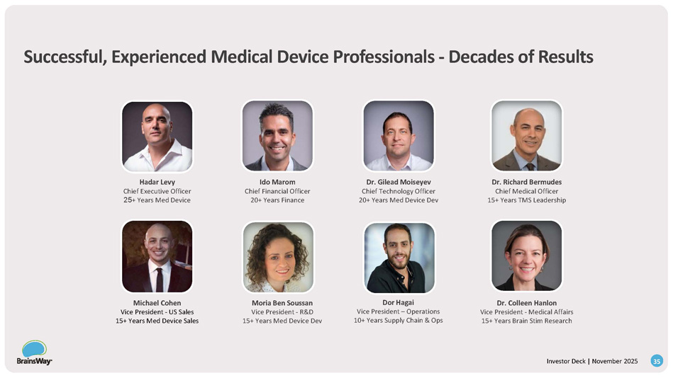 Moria Ben Soussan Vice President - R&D 15+ Years Med Device Dev Hadar Levy Chief Executive Officer 25 + Years Med Device Michael Cohen Vice President - US Sales 15+ Years Med Device Sales Dr. Colleen Hanlon Vice President - Medical Affairs 15+ Years Brain Stim Research Dr. Richard Bermudes Chief Medical Officer 15+ Years TMS Leadership Dr. Gilead Moiseyev Chief Technology Officer 20+ Years Med Device Dev Dor Hagai Vice President – Operations 10+ Years Supply Chain & Ops Ido Marom Chief Financial Officer 20+ Years Finance Successful, Experienced Medical Device Professionals - Decades of Results Investor Deck | November 2025 35