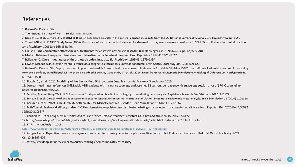 References Investor Deck | November 2025 37 1. BrainsWay Data on File 2. The National Institute of Mental Health: nimh.nih.gov 3. Kessler RC, et al. Comorbidity of DSM - III - R major depressive disorder in the general population: results from the US National Comorbidity Survey Br J Psychiatry Suppl. 1996 4. Trivedi MH et al. STAR*D Study Team (2006), Evaluation of outcomes with citalopram for depression using measurement - based care in STAR*D: implications for clinical practice. Am J Psychiatry. 2006 Jan; 163(1):28 - 40. 5. Greist JH. The comparative effectiveness of treatments for obsessive - compulsive disorder. Bull Menninger Clin. 1998;62(4, suppl 1A):A65 – A81 6. Marks I. Behavior therapy for obsessive - compulsive disorder: a decade of progress. Can J Psychiatry. 1997;42:1021 – 1027 7. Ballenger JC. Current treatments of the anxiety disorders in adults. Biol Psychiatry. 1999;46: 1579 – 1594 8. Lawson McLean A. Publication trends in transcranial magnetic stimulation: a 30 - year panorama. Brain Stimul. 2019 May - Jun;12(3): 619 - 627 9. BrainsWay Data on File; Depth, measured in phantom head, is from cortical surface toward brain center for which E - field >=100V/m for calibrated stimulator output. If measuring from scalp surface, an additional 1.5 cm should be added; See also, Guadagnin, V., et. al., 2016. Deep Transcranial Magnetic Stimulation: Modeling of Different Coil Configurations. 63, 1543 – 1550. 10. Fiocchi, S., et. al., 2016. Modelling of the Electric Field Distribution in Deep Transcranial Magnetic Stimulation. 2016 11. Company estimates, references 3.4M adult MDD patients with insurance coverage and assumes 33 sessions per patient with an average session price of $70; Oppenheimer Research Report, 08/24/2020 12. Tendler, A, et al. Deep TMS H1 Coil treatment for depression: Results from a large post marketing data analysis. Psychiatry Research. Vol 324, June 2023, 115179 13. Senova S, et al. Durability of antidepressant response to repetitive transcranial magnetic stimulation: Systematic review and meta - analysis. Brain Stimulation 12 (2019) 119e128 14. Gersner R, et al. What is the durability of Deep TMS for Major Depressive Disorder. Brain Stimulation 13 (2020) 1842 - 1862 15. Roth Y, et al. Real - world efficacy of deep TMS for obsessive - compulsive disorder: Post - marketing data collected from twenty - two clinical sites. J Psychiatr Res. 2020 Nov 4;S0022 3956(20)31065 - 7 16. Harmelech T et al. Long - term outcomes of a course of deep TMS for treatment - resistant OCD. Brain Stimulation 15 (2022) 226e228 17 .https://www.cdc.gov/tobacco/data_statistics/fact_sheets/cessation/smoking - cessation - fast - facts/index.html. Data as of 2018 for U.S. adults. 18. EY Parthenon Analysis 2018 https://www.smokefreeworld.org/sites/default/files/ey - p_smoking_cessation_landscape_analysis_key_findings.pdf 19. Zangen A et al. Repetitive transcranial magnetic stimulation for smoking cessation: a pivotal multicenter double - blind randomized controlled trial. World Psychiatry. 2021 Oct;20(3):397 - 404 20. https://worldpopulationreview.com/country - rankings/depression - rates - by - country
