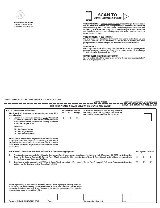 Note 4: Documents to be discussed at the Annual General Shareholders’ Meeting are available to the shareholders at the Company’s registered office at Maples Corporate Services (BVI) Limited, Kingston Chambers, Road Town, Tortola, British Virgin Islands, Attention: Mr. Ruairi Bourke, B.V.I. Direct: + 1 284 852 3038 (email: ruairi.bourke@maples.com) on business days from 10:00 a.m. to 12:00 p.m. and from 3:00 p.m. to 5:00 p.m. local time, from April 4, 2024 to April 24, 2024 inclusive; and at the Company’s offices at Roque Saenz Peña 432, Olivos, Buenos Aires, Argentina, Attention: Ms. Victoria Bellocq (email: Victoria.bellocq@ar.mcd.com), on business days from 10:00 a.m. to 12:00 p.m. and from 2:00 p.m. to 4:00 p.m. local time, from April 4, 2024 to April 24, 2024 inclusive.