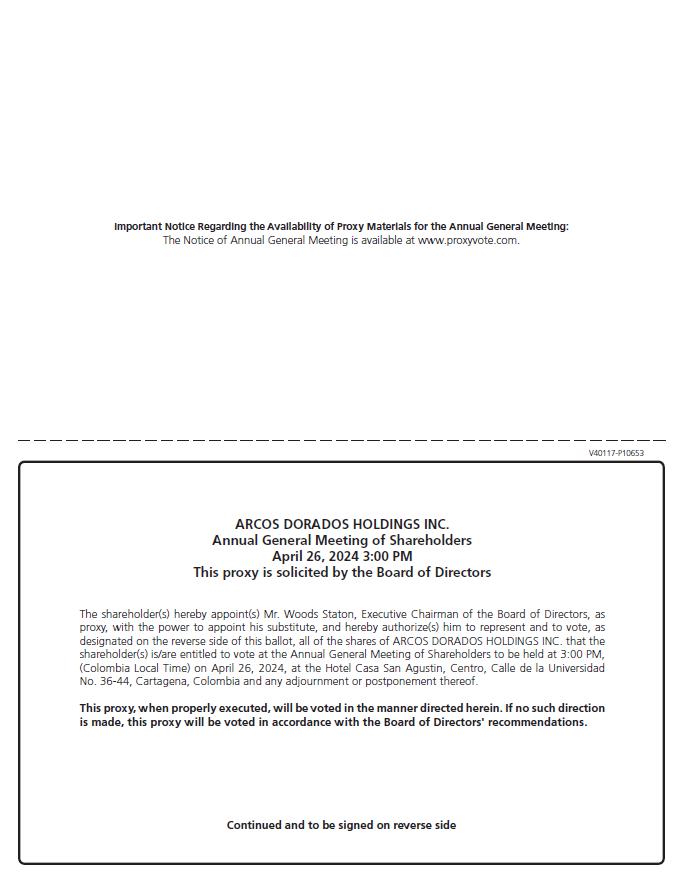 As provided for in the notice to the shareholders (the “Shareholders”) of Arcos Dorados Holdings Inc. (the “Company”) issued by the Company on March 8, 2024, the Shareholders are invited to the 2024 Annual General Shareholders’ Meeting to be held on April 26, 2024, at 3:00 p.m. (Colombia local time) at the Hotel Casa San Agustin, Centro, Calle de la Universidad No. 36-44, Cartagena, Colombia, to consider and, if appropriate, pass the proposals referred to in the Agenda below as resolutions of Shareholders: