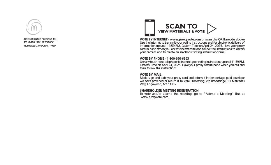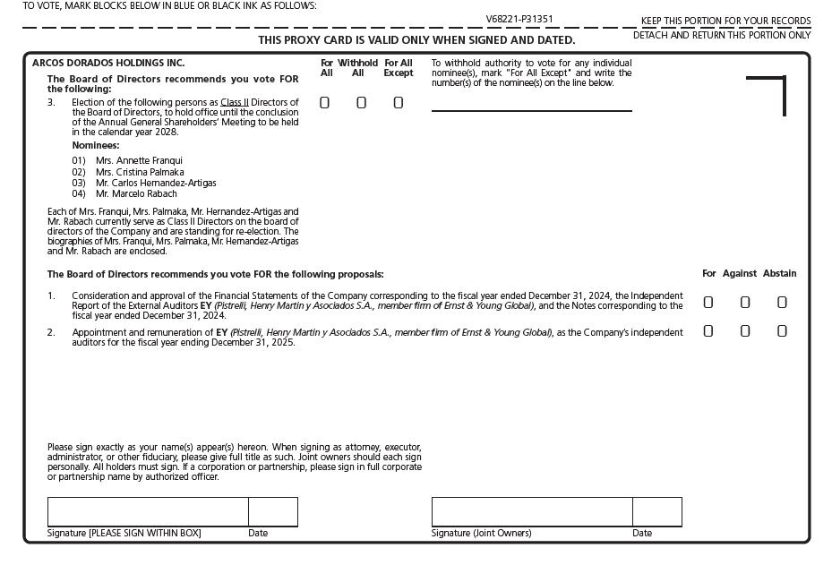 ARCOS DORADOS HOLDINGS INC. RIO NEGRO 1338, FIRST FLOOR MONTEVIDEO, URUGUAY, 11100 SCAN TO VIEW MATERIALS & VOTE w VOTE BY INTERNET - www.proxyvote.com or scan the QR Barcode above Use the Internet to transmit your voting instructions and for electronic delivery of information up until 11:59 P.M. Eastern Time on April 24, 2025. Have your proxy card in hand when you access the website and follow the instructions to obtain your records and to create an electronic voting instruction form. VOTE BY PHONE - 1-800-690-6903 Use any touch-tone telephone to transmit your voting instructions up until 11:59 P.M. Eastern Time on April 24, 2025. Have your proxy card in hand when you call and then follow the instructions. VOTE BY MAIL Mark, sign and date your proxy card and return it in the postage-paid envelope we have provided or return it to Vote Processing, c/o Broadridge, 51 Mercedes Way, Edgewood, NY 11717. SHAREHOLDER MEETING REGISTRATION To vote and/or attend the meeting, go to "Attend a Meeting" link at www.proxyvote.com TO VOTE, MARK BLOCKS BELOW IN BLUE OR BLACK INK AS FOLLOWS: V68221-P31351 KEEP THIS PORTION FOR YOUR RECORDS THIS PROXY CARD IS VALID ONLY WHEN SIGNED AND DATED. DETACH AND RETURN THIS PORTION ONLY ARCOS DORADOS HOLDINGS INC. 3. Election of the following persons as Class II Directors of the Board of Directors, to hold office until the conclusion of the Annual General Shareholders’ Meeting to be held in the calendar year 2028. The Board of Directors recommends you vote FOR the following: 01) Mrs. Annette Franqui 02) Mrs. Cristina Palmaka 03) Mr. Carlos Hernandez-Artigas 04) Mr. Marcelo Rabach Nominees: Each of Mrs. Franqui, Mrs. Palmaka, Mr. Hernandez-Artigas and Mr. Rabach currently serve as Class II Directors on the board of directors of the Company and are standing for re-election. The biographies of Mrs. Franqui, Mrs. Palmaka, Mr. Hernandez-Artigas and Mr. Rabach are enclosed. For All Withhold All For All Except To withhold authority to vote for any individual nominee(s), mark "For All Except" and write the number(s) of the nominee(s) on the line below. The Board of Directors recommends you vote FOR the following proposals: For Against Abstain 1. Consideration and approval of the Financial Statements of the Company corresponding to the fiscal year ended December 31, 2024, the Independent Report of the External Auditors EY (Pistrelli, Henry Martin y Asociados S.A., member firm of Ernst & Young Global), and the Notes corresponding to the fiscal year ended December 31, 2024. 2. Appointment and remuneration of EY (Pistrelli, Henry Martin y Asociados S.A., member firm of Ernst & Young Global), as the Company’s independent auditors for the fiscal year ending December 31, 2025. Please sign exactly as your name(s) appear(s) hereon. When signing as attorney, executor, administrator, or other fiduciary, please give full title as such. Joint owners should each sign personally. All holders must sign. If a corporation or partnership, please sign in full corporate or partnership name by authorized officer. Signature [PLEASE SIGN WITHIN BOX] Date Signature (Joint Owners) Date