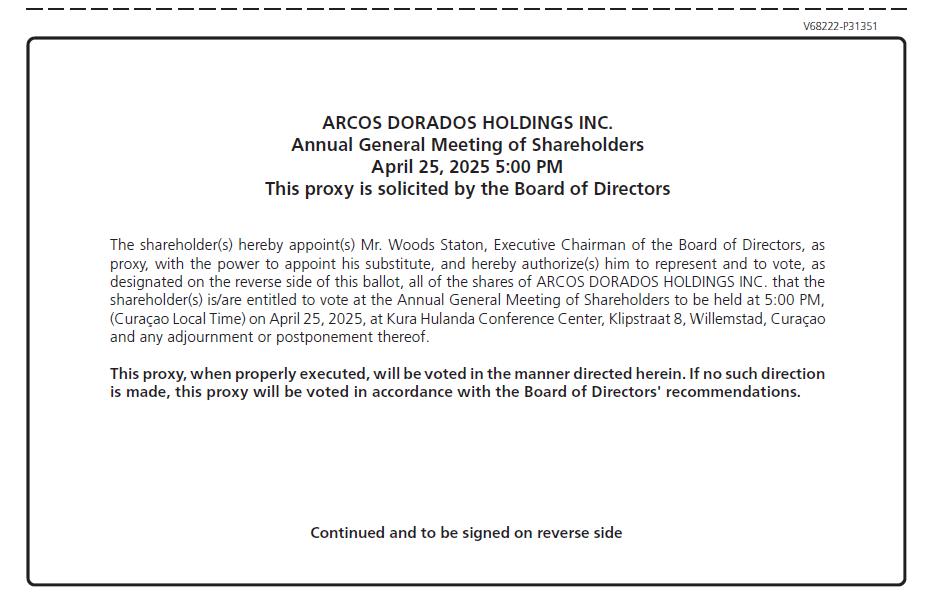Important Notice Regarding the Availability of Proxy Materials for the Annual General Meeting: The Notice of Annual General Meeting and Shareholder Letter are available at www.proxyvote.com. V68222-P31351 ARCOS DORADOS HOLDINGS INC. Annual General Meeting of Shareholders April 25, 2025 5:00 PM This proxy is solicited by the Board of Directors The shareholder(s) hereby appoint(s) Mr. Woods Staton, Executive Chairman of the Board of Directors, as proxy, with the power to appoint his substitute, and hereby authorize(s) him to represent and to vote, as designated on the reverse side of this ballot, all of the shares of ARCOS DORADOS HOLDINGS INC. that the shareholder(s) is/are entitled to vote at the Annual General Meeting of Shareholders to be held at 5:00 PM, (Curaçao Local Time) on April 25, 2025, at Kura Hulanda Conference Center, Klipstraat 8, Willemstad, Curaçao and any adjournment or postponement thereof. This proxy, when properly executed, will be voted in the manner directed herein. If no such direction is made, this proxy will be voted in accordance with the Board of Directors' recommendations. Continued and to be signed on reverse side