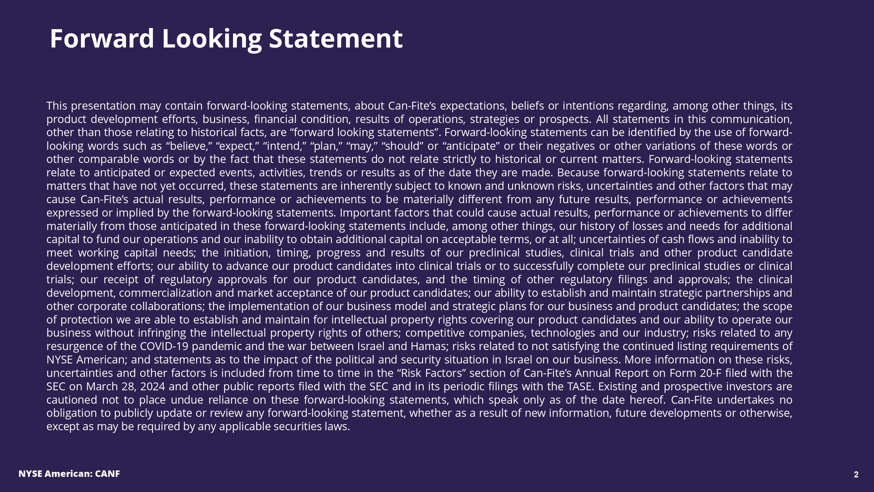 Forward Looking Statement This presentation may contain forward - looking statements, about Can - Fite’s expectations, beliefs or intentions regarding, among other things, its product development efforts, business, financial condition, results of operations, strategies or prospects . All statements in this communication, other than those relating to historical facts, are “forward looking statements” . Forward - looking statements can be identified by the use of forward - looking words such as “believe,” “expect,” “intend,” “plan,” “may,” “should” or “anticipate” or their negatives or other variations of these words or other comparable words or by the fact that these statements do not relate strictly to historical or current matters . Forward - looking statements relate to anticipated or expected events, activities, trends or results as of the date they are made . Because forward - looking statements relate to matters that have not yet occurred, these statements are inherently subject to known and unknown risks, uncertainties and other factors that may cause Can - Fite’s actual results, performance or achievements to be materially different from any future results, performance or achievements expressed or implied by the forward - looking statements . Important factors that could cause actual results, performance or achievements to differ materially from those anticipated in these forward - looking statements include, among other things, our history of losses and needs for additional capital to fund our operations and our inability to obtain additional capital on acceptable terms, or at all ; uncertainties of cash flows and inability to meet working capital needs ; the initiation, timing, progress and results of our preclinical studies, clinical trials and other product candidate development efforts ; our ability to advance our product candidates into clinical trials or to successfully complete our preclinical studies or clinical trials ; our receipt of regulatory approvals for our product candidates, and the timing of other regulatory filings and approvals ; the clinical development, commercialization and market acceptance of our product candidates ; our ability to establish and maintain strategic partnerships and other corporate collaborations ; the implementation of our business model and strategic plans for our business and product candidates ; the scope of protection we are able to establish and maintain for intellectual property rights covering our product candidates and our ability to operate our business without infringing the intellectual property rights of others ; competitive companies, technologies and our industry ; risks related to any resurgence of the COVID - 19 pandemic and the war between Israel and Hamas ; risks related to not satisfying the continued listing requirements of NYSE American ; and statements as to the impact of the political and security situation in Israel on our business . More information on these risks, uncertainties and other factors is included from time to time in the “Risk Factors” section of Can - Fite’s Annual Report on Form 20 - F filed with the SEC on March 28 , 2024 and other public reports filed with the SEC and in its periodic filings with the TASE . Existing and prospective investors are cautioned not to place undue reliance on these forward - looking statements, which speak only as of the date hereof . Can - Fite undertakes no obligation to publicly update or review any forward - looking statement, whether as a result of new information, future developments or otherwise, except as may be required by any applicable securities laws . NYSE American: CANF