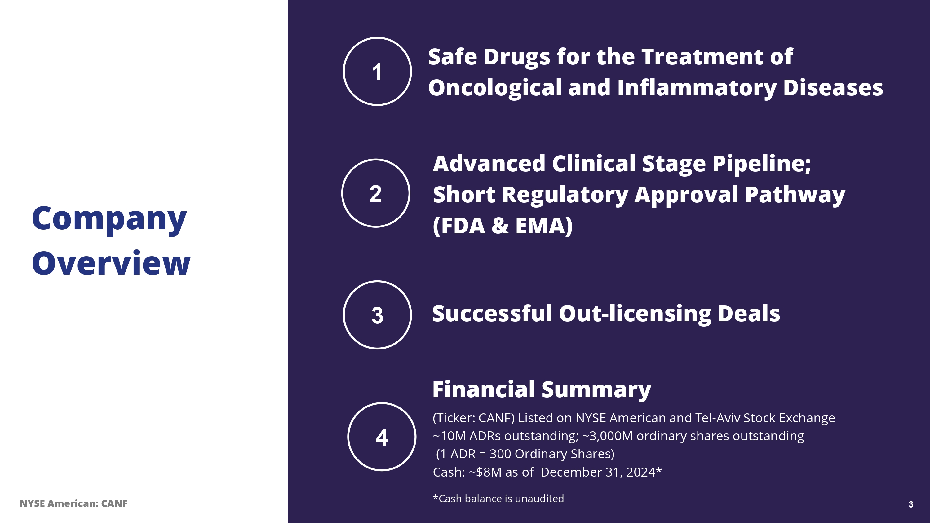 Safe Drugs for the Treatment of Oncological and Inflammatory Diseases Advanced Clinical Stage Pipeline; Short Regulatory Approval Pathway (FDA & EMA) Successful Out - licensing Deals Company Overview 1 2 3 Financial Summary 4 NYSE American: CANF
