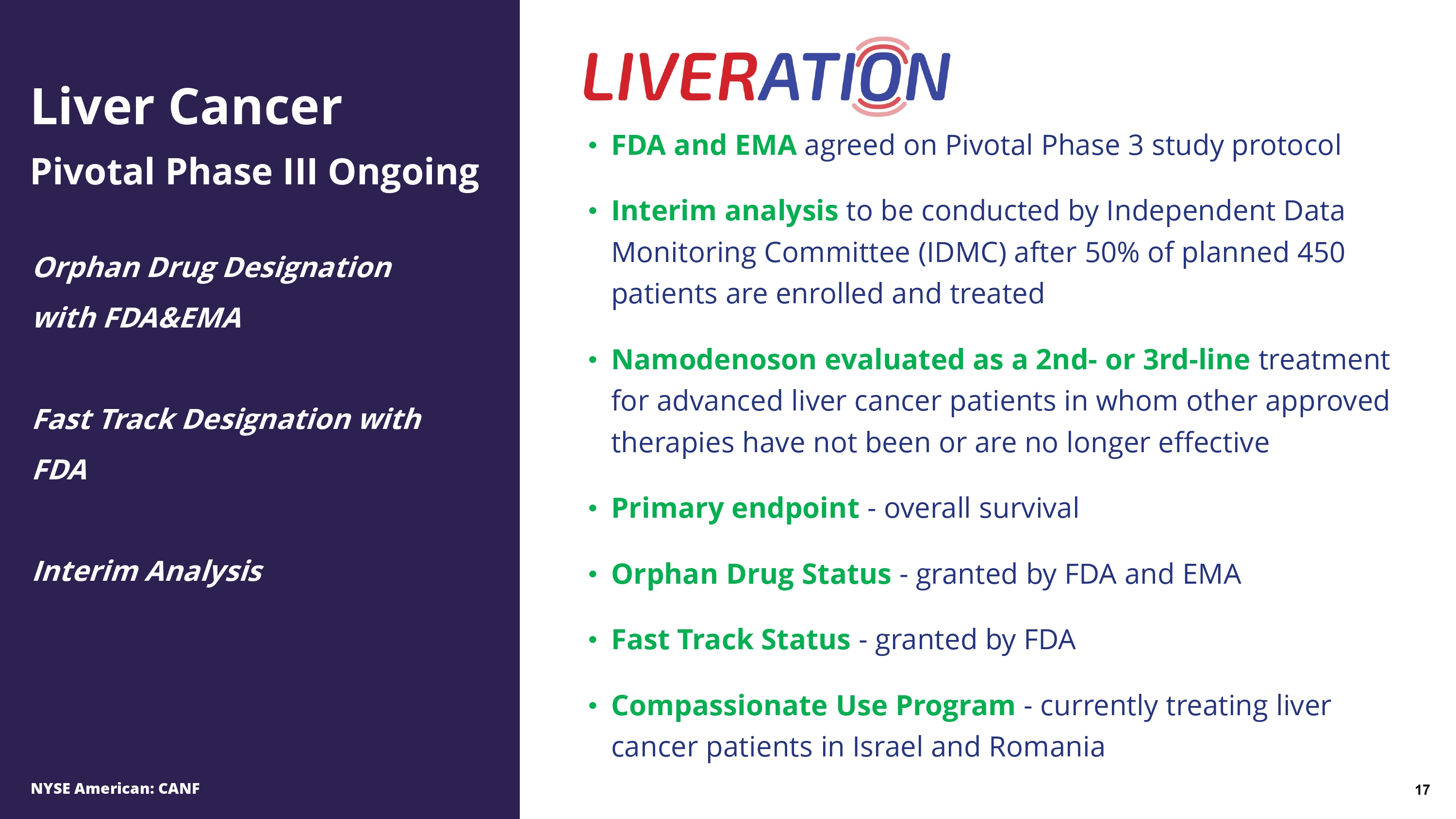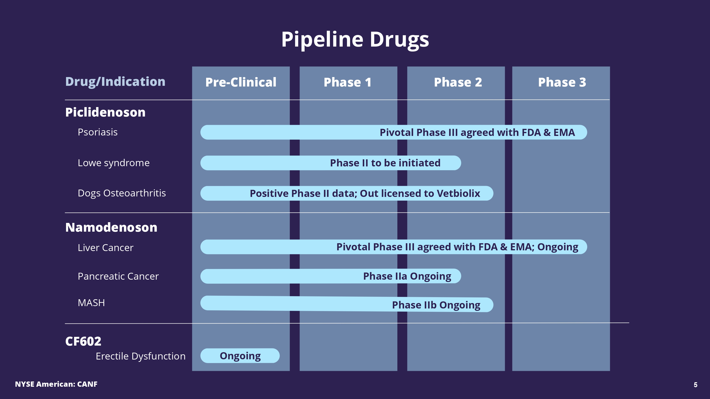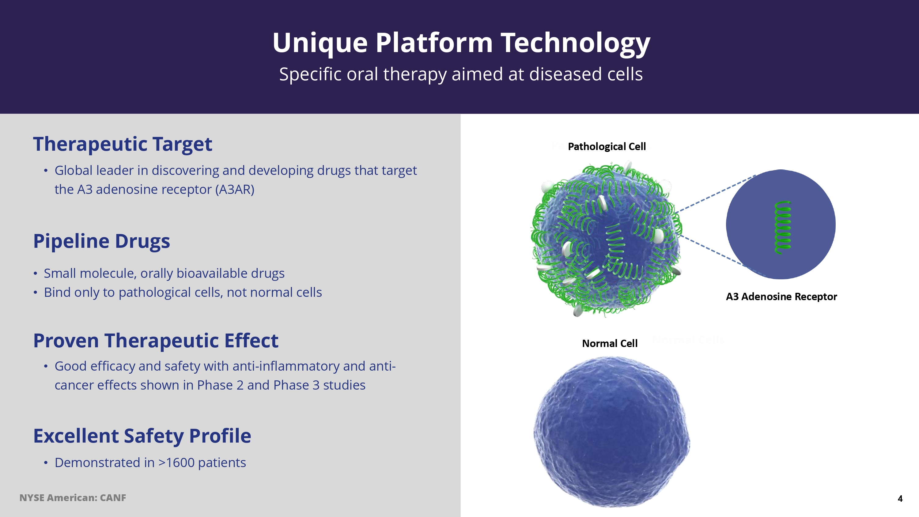 Global leader in discovering and developing drugs that target the A3 adenosine receptor (A3AR) Therapeutic Target • Demonstrated in > 1600 patients Excellent Safety Profile • Good efficacy and safety with anti - inflammatory and anti - cancer effects shown in Phase 2 and Phase 3 studies Proven Therapeutic Effect • Small molecule, orally bioavailable drugs • Bind only to pathological cells, not normal cells Pipeline Drugs Unique Platform Technology Specific oral therapy aimed at diseased cells A3 Adenosine Receptor Pathological Cell Normal Cell NYSE American: CANF