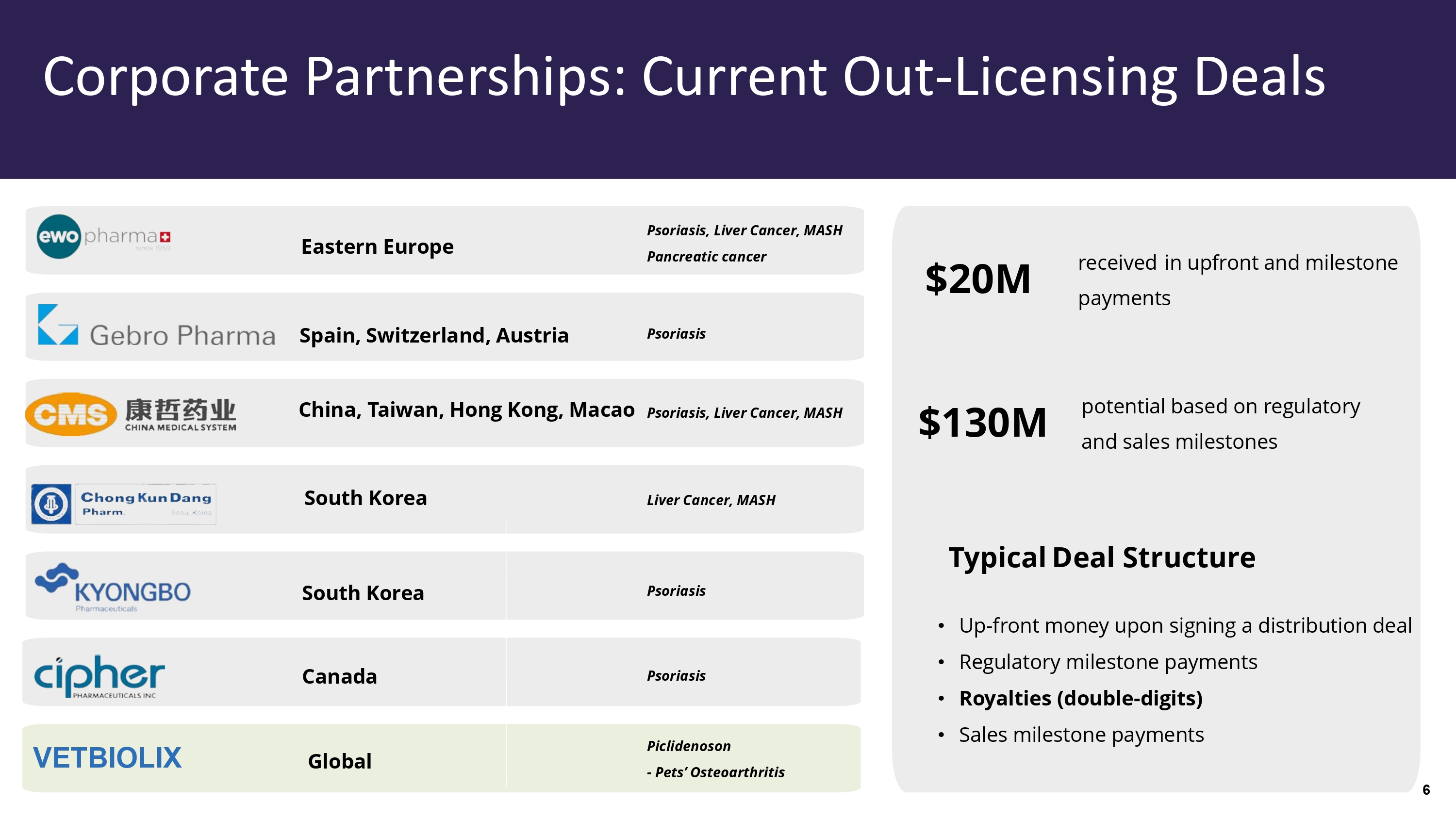 potential based on regulatory and sales milestones $ 20M received in upfront and milestone payments $ 130 M Psoriasis, Liver Cancer, MASH Liver Cancer, MASH Psoriasis Psoriasis Psoriasis, Liver Cancer, MASH Pancreatic cancer Typical Deal Structure • Up - front money upon signing a distribution deal • Regulatory milestone payments • Royalties (double - digits) • Sales milestone payments VETBIOLIX Psoriasis Piclidenoson - Pets ’ Osteoarthritis Canada Spain, Switzerland, Austria South Korea South Korea China, Taiwan, Hong Kong, Macao Global Eastern Europe Corporate Partnerships: Current Out - Licensing Deals