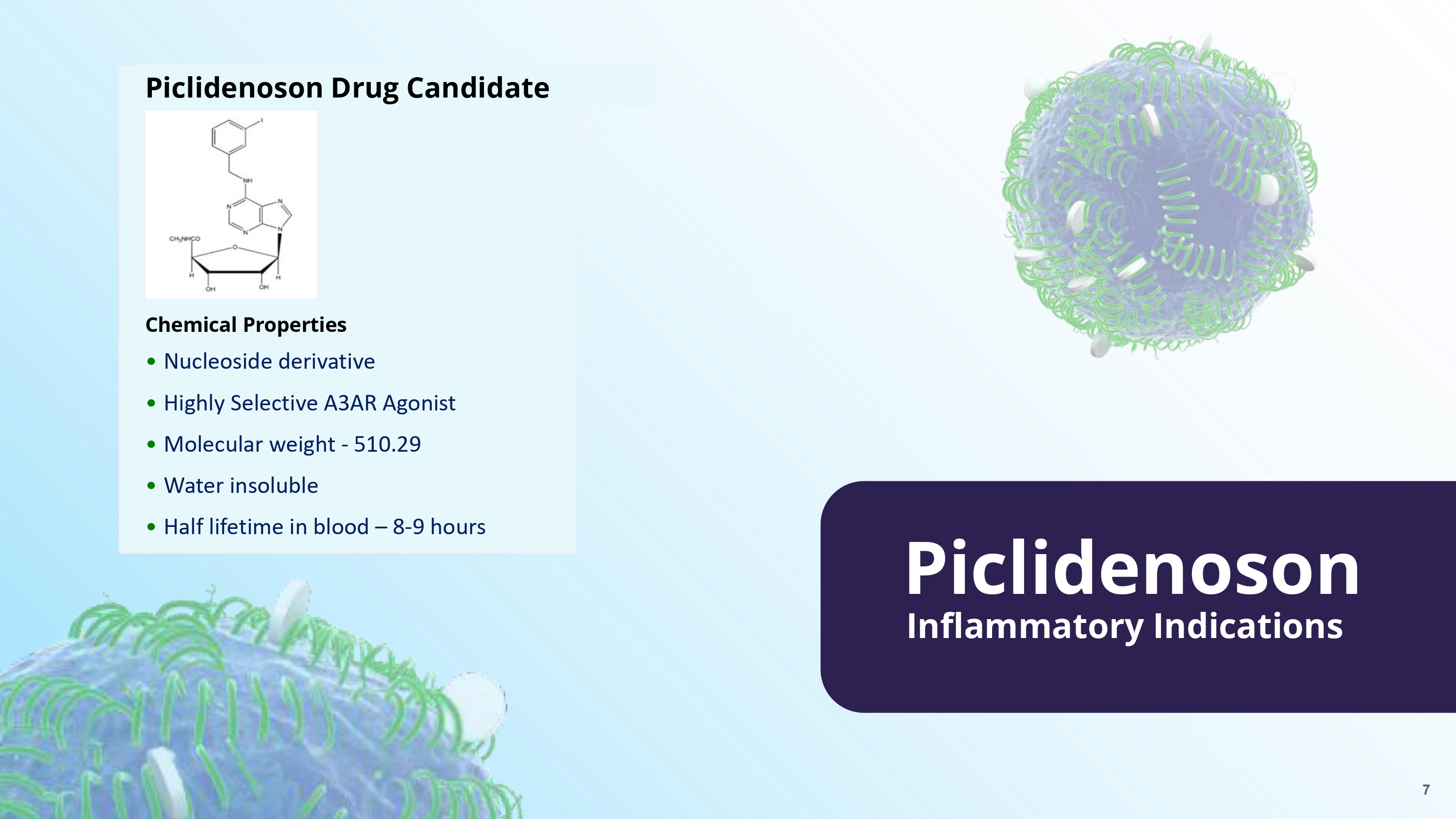 Inflammatory Indications Piclidenoson • Nucleoside derivative • Highly Selective A 3 AR Agonist • Molecular weight - 510.29 • Water insoluble • Half lifetime in blood – 8 - 9 hours Piclidenoson Drug Candidate Chemical Properties