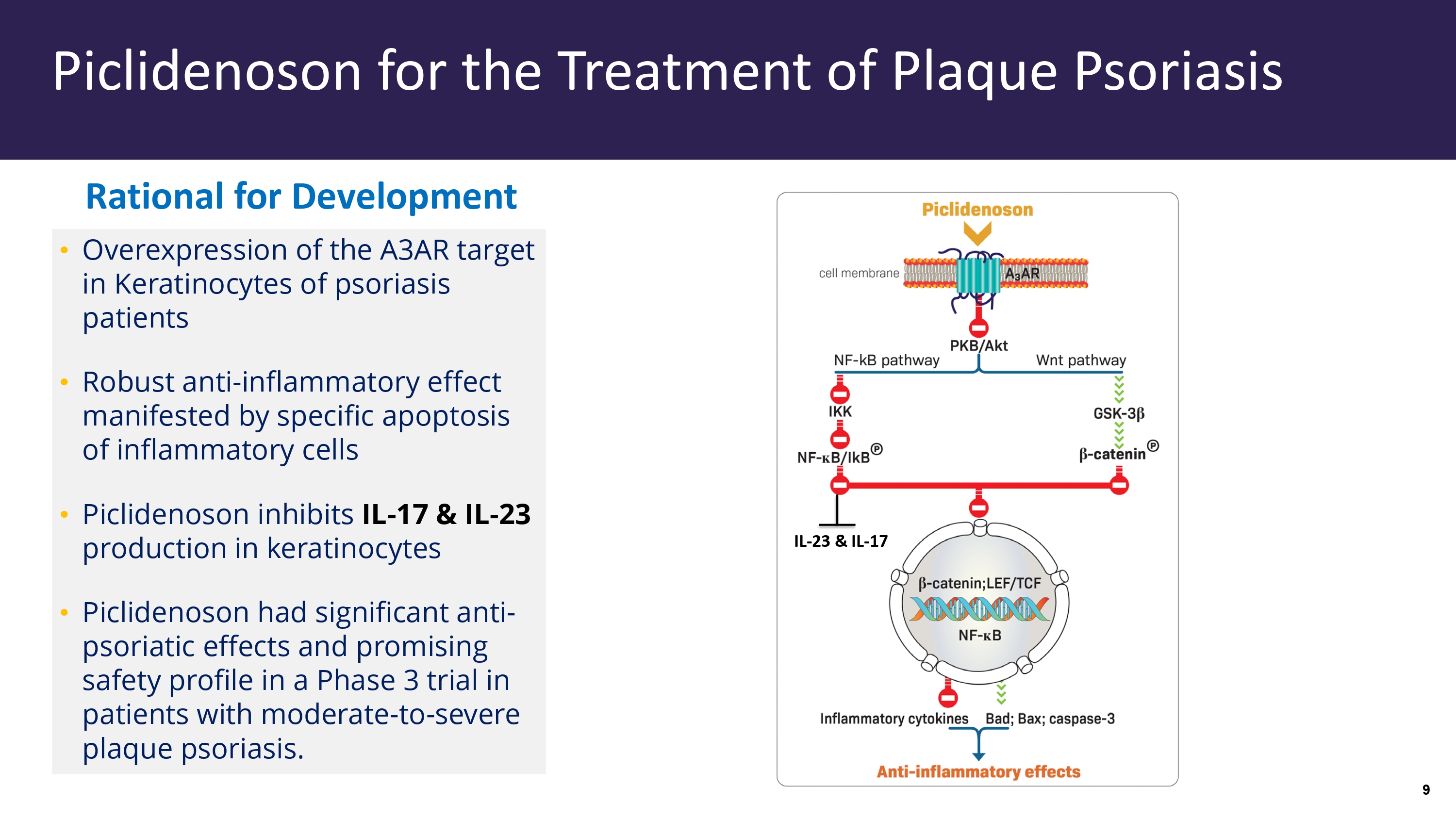 • Overexpression of the A3AR target in Keratinocytes of psoriasis patients • Robust anti - inflammatory effect manifested by specific apoptosis of inflammatory cells • Piclidenoson inhibits IL - 17 & IL - 23 production in keratinocytes • Piclidenoson had significant anti - psoriatic effects and promising safety profile in a Phase 3 trial in patients with moderate - to - severe plaque psoriasis. Piclidenoson for the Treatment of Plaque Psoriasis IL - 23 & IL - 17 Rational for Development