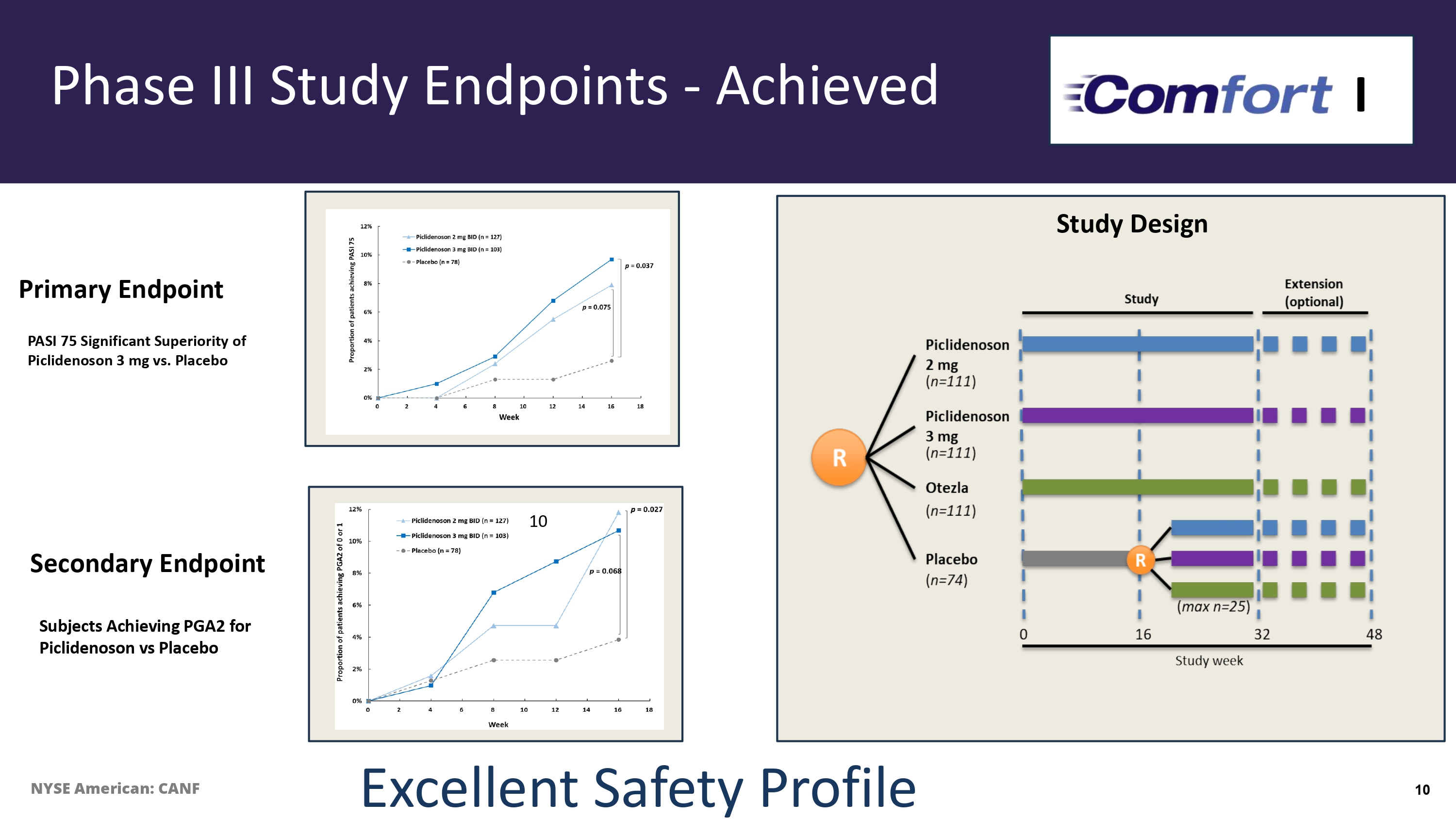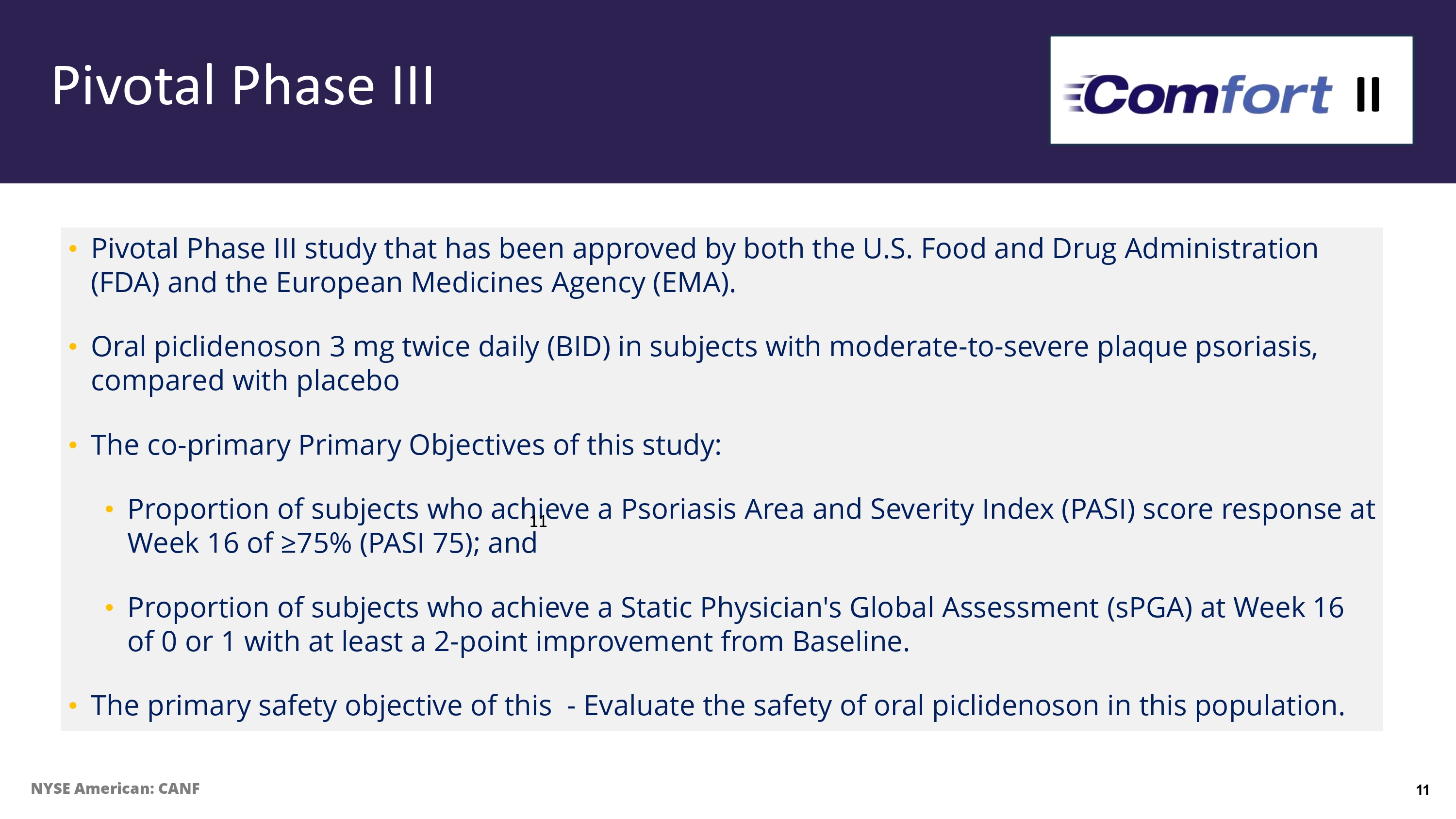 Phase III Study Endpoints - Achieved PASI 75 Significant Superiority of Piclidenoson 3 mg vs. Placebo Primary Endpoint Secondary Endpoint Subjects Achieving PGA 2 for Piclidenoson vs Placebo I Study Design Excellent Safety Profile 10 NYSE American: CANF
