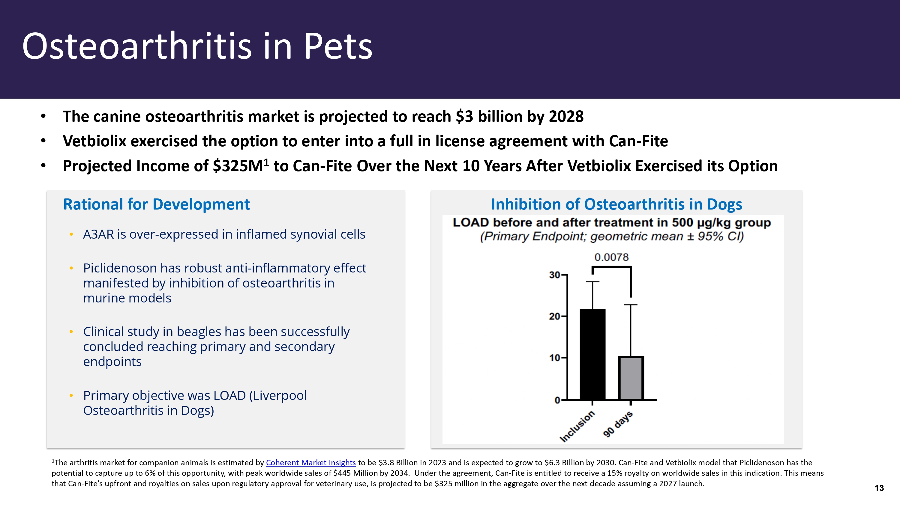 A 3 AR is over - expressed in inflamed synovial cells • Piclidenoson has robust anti - inflammatory effect manifested by inhibition of osteoarthritis in murine models • Clinical study in beagles has been successfully concluded reaching primary and secondary endpoints • Primary objective was LOAD (Liverpool Osteoarthritis in Dogs) Rational for Development Inhibition of Osteoarthritis in Dogs Osteoarthritis in Pets • The canine osteoarthritis market is projected to reach $ 3 billion by 2028 • Vetbiolix exercised the option to enter into a full in license agreement with Can - Fite • Projected Income of $ 325 M 1 to Can - Fite Over the Next 10 Years After Vetbiolix Exercised its Option 1 The arthritis market for companion animals is estimated by Coherent Market Insights to be $ 3.8 Billion in 2023 and is expected to grow to $ 6.3 Billion by 2030 . Can - Fite and Vetbiolix model that Piclidenoson has the potential to capture up to 6 % of this opportunity, with peak worldwide sales of $ 445 Million by 2034 . Under the agreement, Can - Fite is entitled to receive a 15 % royalty on worldwide sales in this indication. This means that Can - Fite ’ s upfront and royalties on sales upon regulatory approval for veterinary use, is projected to be $ 325 million in the aggregate over the next decade assuming a 2027 launch.