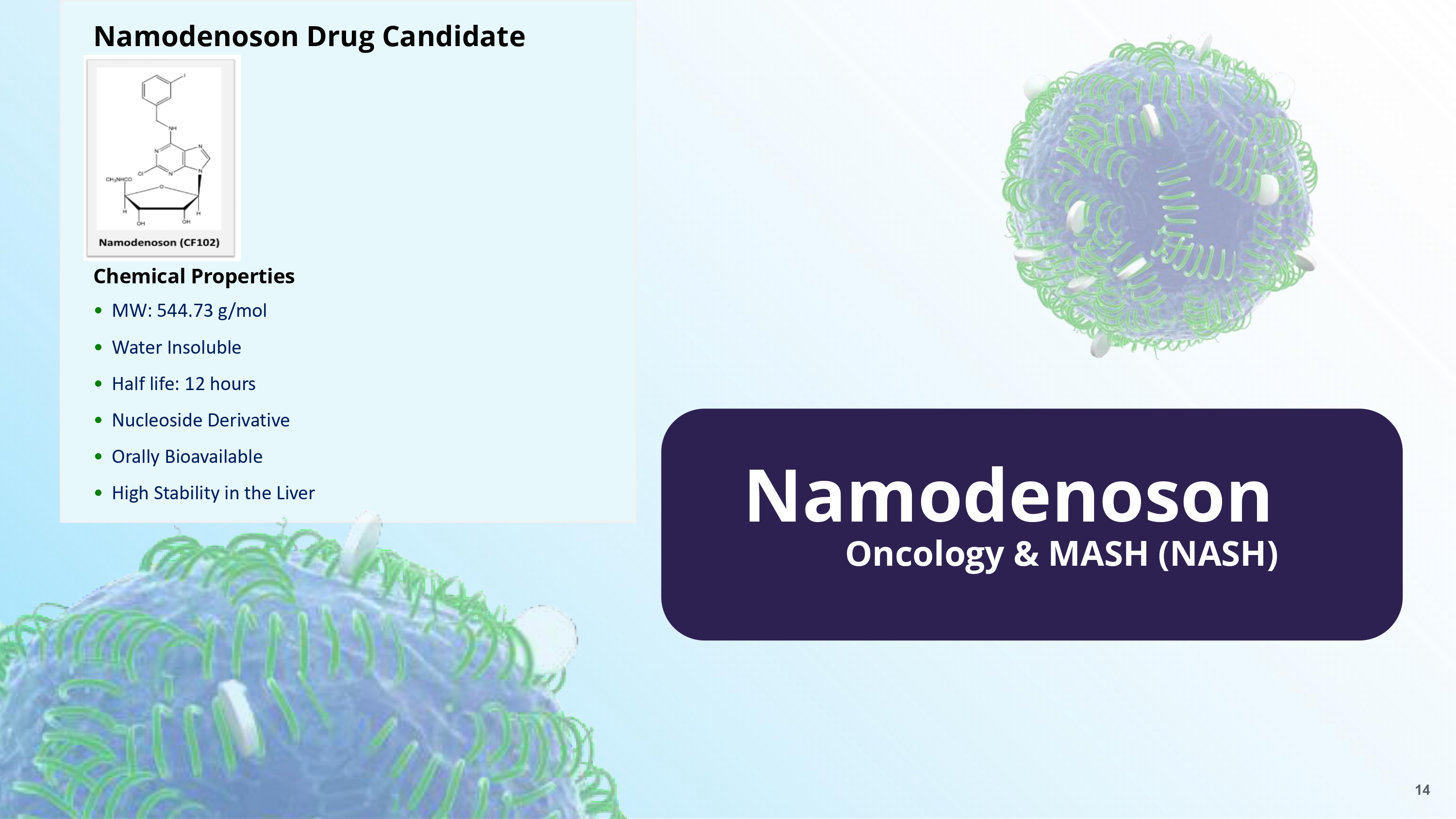 Oncology & MASH (NASH) Namodenoson • MW: 544.73 g/mol • Water Insoluble • Half life: 12 hours • Nucleoside Derivative • Orally Bioavailable • High Stability in the Liver Namodenoson Drug Candidate Chemical Properties