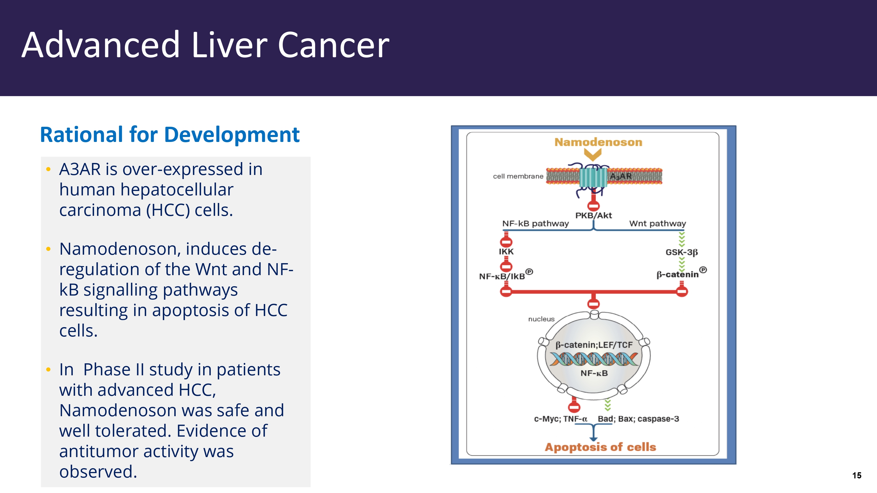 A 3 AR is over - expressed in human hepatocellular carcinoma (HCC) cells. • Namodenoson, induces de - regulation of the Wnt and NF - kB signalling pathways resulting in apoptosis of HCC cells. • In Phase II study in patients with advanced HCC, Namodenoson was safe and well tolerated. Evidence of antitumor activity was observed. Rational for Development IL - 23 & IL - 17 Advanced Liver Cancer