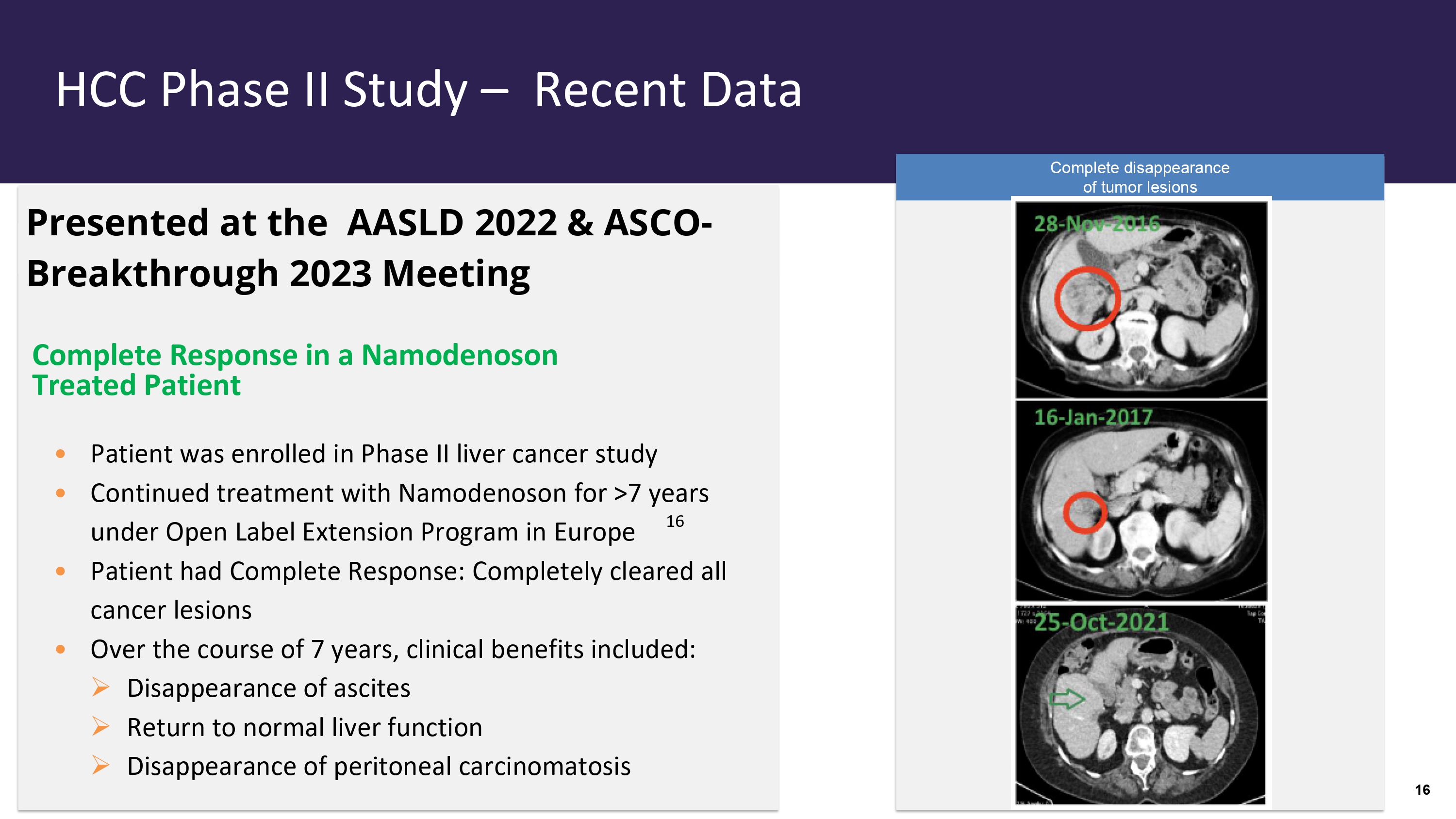 HCC Phase II Study – Recent Data • Patient was enrolled in Phase II liver cancer study • Continued treatment with Namodenoson for > 7 years under Open Label Extension Program in Europe • Patient had Complete Response: Completely cleared all cancer lesions • Over the course of 7 years, clinical benefits included: » Disappearance of ascites » Return to normal liver function » Disappearance of peritoneal carcinomatosis Complete disappearance of tumor lesions Presented at the AASLD 2022 & ASCO - Breakthrough 2023 Meeting Complete Response in a Namodenoson Treated Patient 16