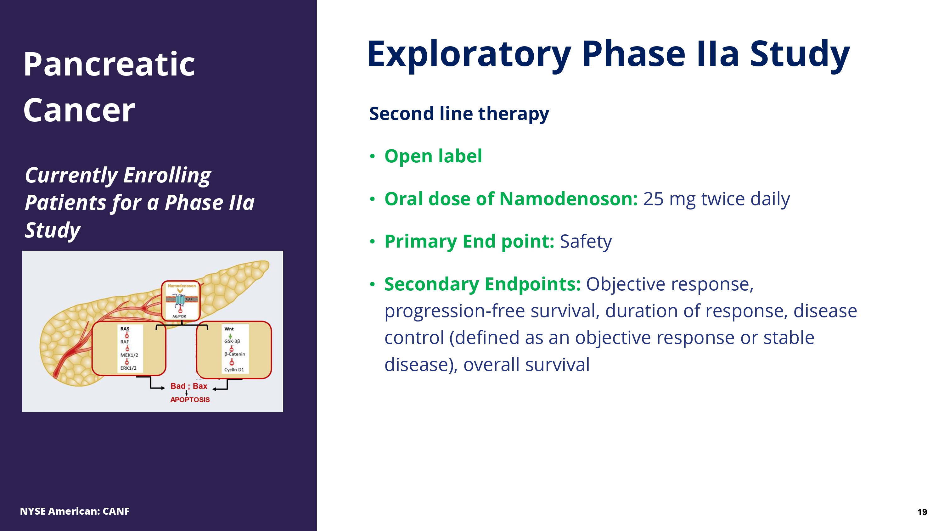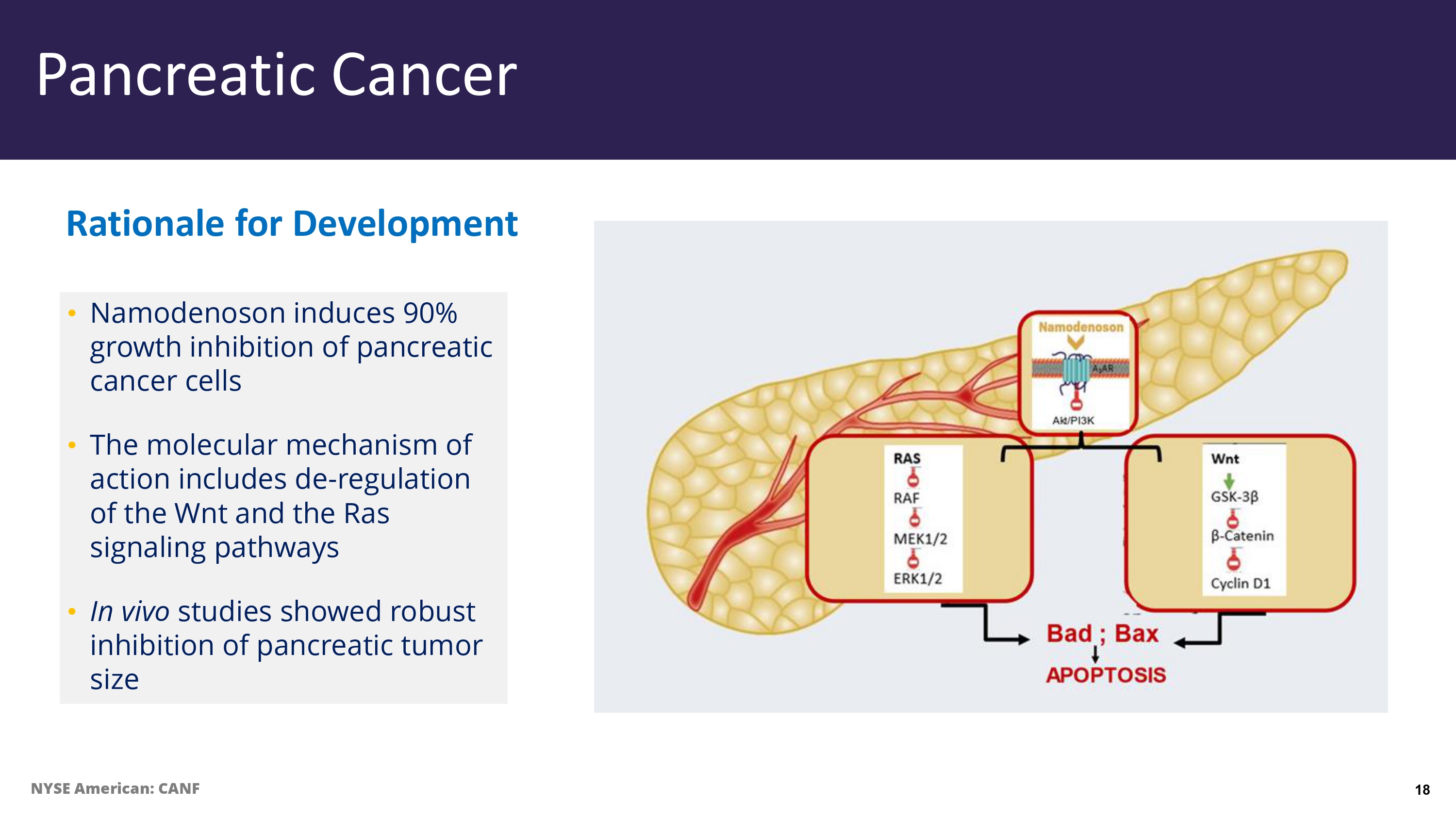Namodenoson induces 90 % growth inhibition of pancreatic cancer cells • The molecular mechanism of action includes de - regulation of the Wnt and the Ras signaling pathways • In vivo studies showed robust inhibition of pancreatic tumor size Rationale for Development Pancreatic Cancer NYSE American: CANF