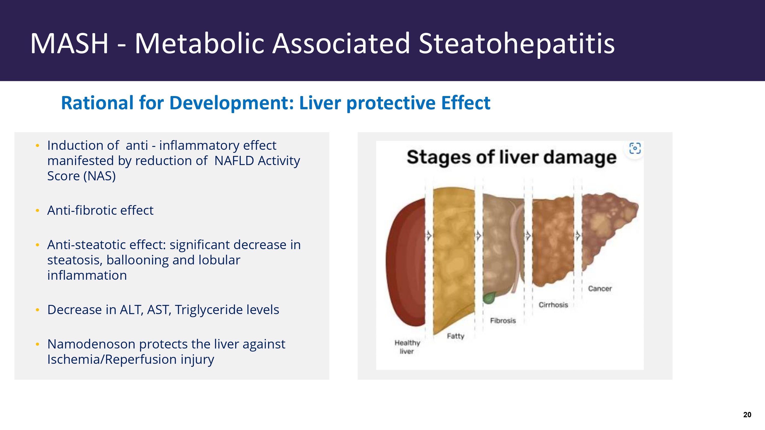 Induction of anti - inflammatory effect manifested by reduction of NAFLD Activity Score (NAS) • Anti - fibrotic effect • Anti - steatotic effect: significant decrease in steatosis, ballooning and lobular inflammation • Decrease in ALT, AST, Triglyceride levels • Namodenoson protects the liver against Ischemia/Reperfusion injury Rational for Development: Liver protective Effect MASH - Metabolic A ssociated Steatohepatitis