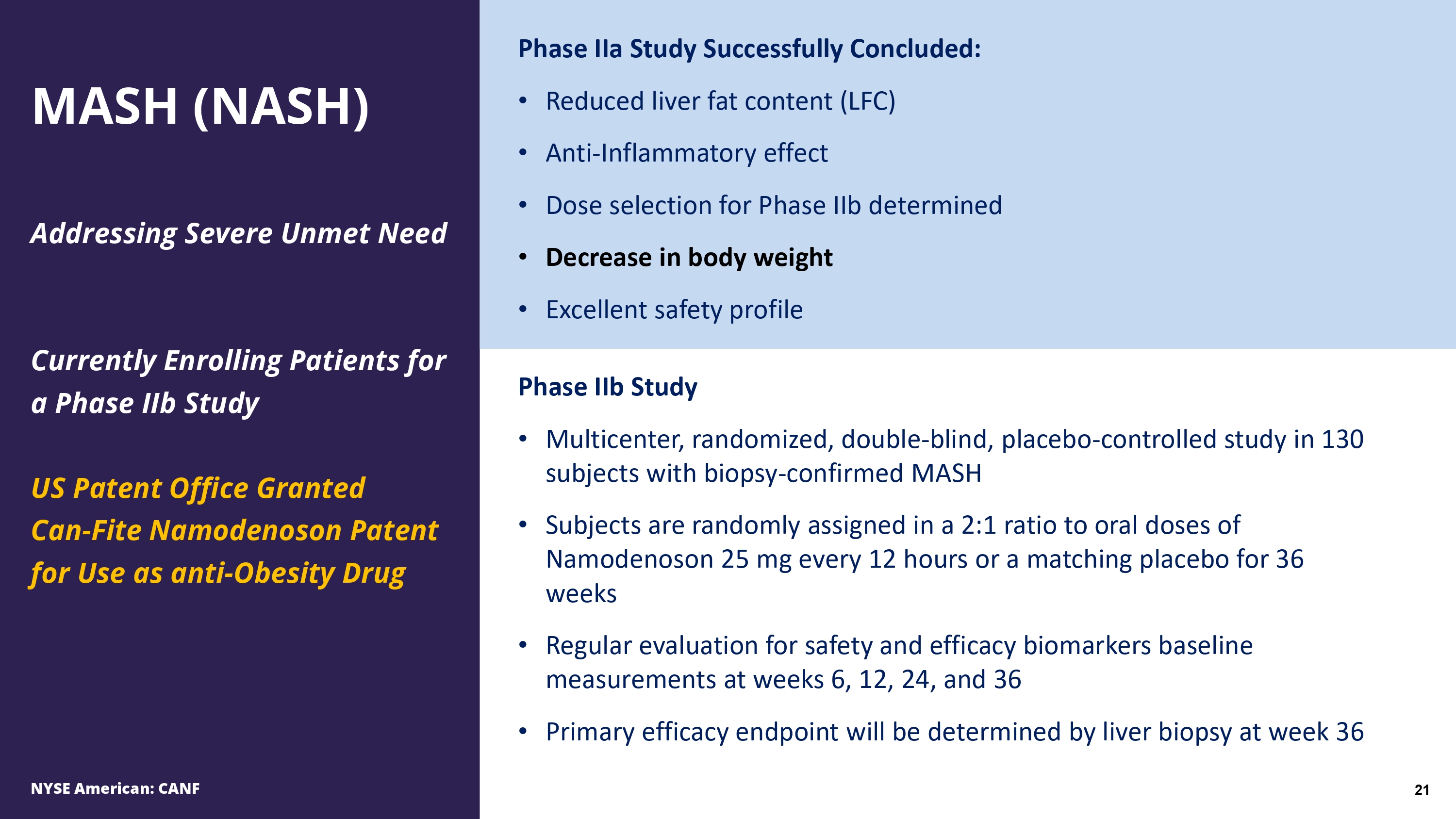 Phase IIa Study Successfully Concluded: • Reduced liver fat content (LFC) • Anti - Inflammatory effect • Dose selection for Phase IIb determined • Decrease in body weight • Excellent safety profile Addressing Severe Unmet Need Currently Enrolling Patients for a Phase IIb Study US Patent Office Granted Can - Fite Namodenoson Patent for Use as anti - Obesity Drug Phase IIb Study • Multicenter, randomized, double - blind, placebo - controlled study in 130 subjects with biopsy - confirmed MASH • Subjects are randomly assigned in a 2:1 ratio to oral doses of Namodenoson 25 mg every 12 hours or a matching placebo for 36 weeks • Regular evaluation for safety and efficacy biomarkers baseline measurements at weeks 6 , 12 , 24 , and 36 • Primary efficacy endpoint will be determined by liver biopsy at week 36 MASH (NASH)