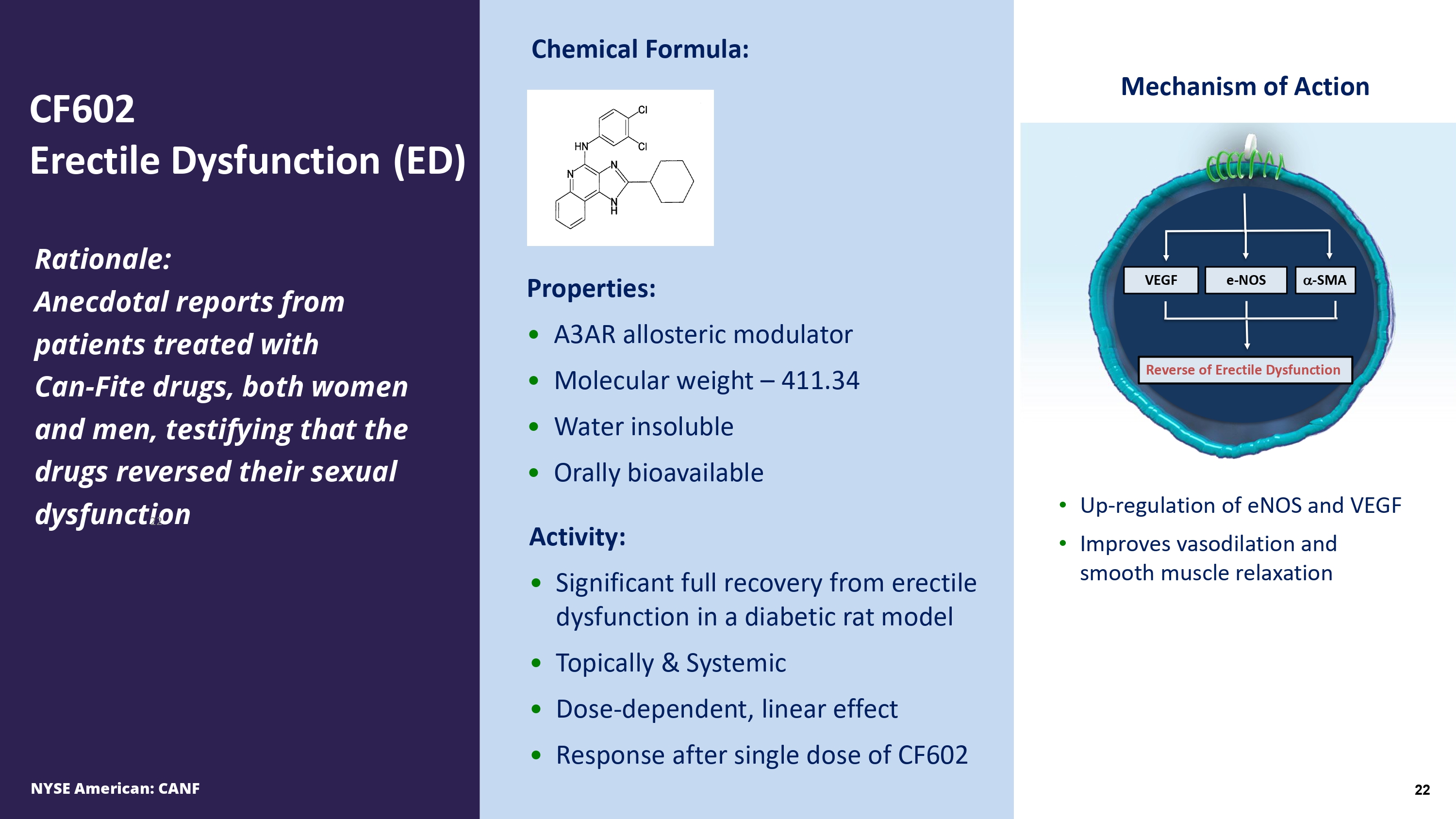 VEGF - SMA e - NOS Reverse of Erectile Dysfunction Mechanism of Action Up - regulation of eNOS and VEGF • Improves vasodilation and smooth muscle relaxation Rationale: Anecdotal reports from patients treated with Can - Fite drugs, both women and men, testifying that the drugs reversed their sexual dysfunction Properties: • A 3 AR allosteric modulator • Molecular weight – 411.34 • Water insoluble • Orally bioavailable Activity: • Significant full recovery from erectile dysfunction in a diabetic rat model • Topically & Systemic • Dose - dependent, linear effect • Response after single dose of CF 602 CF 602 Erectile Dysfunction (ED) Chemical Formula: 22
