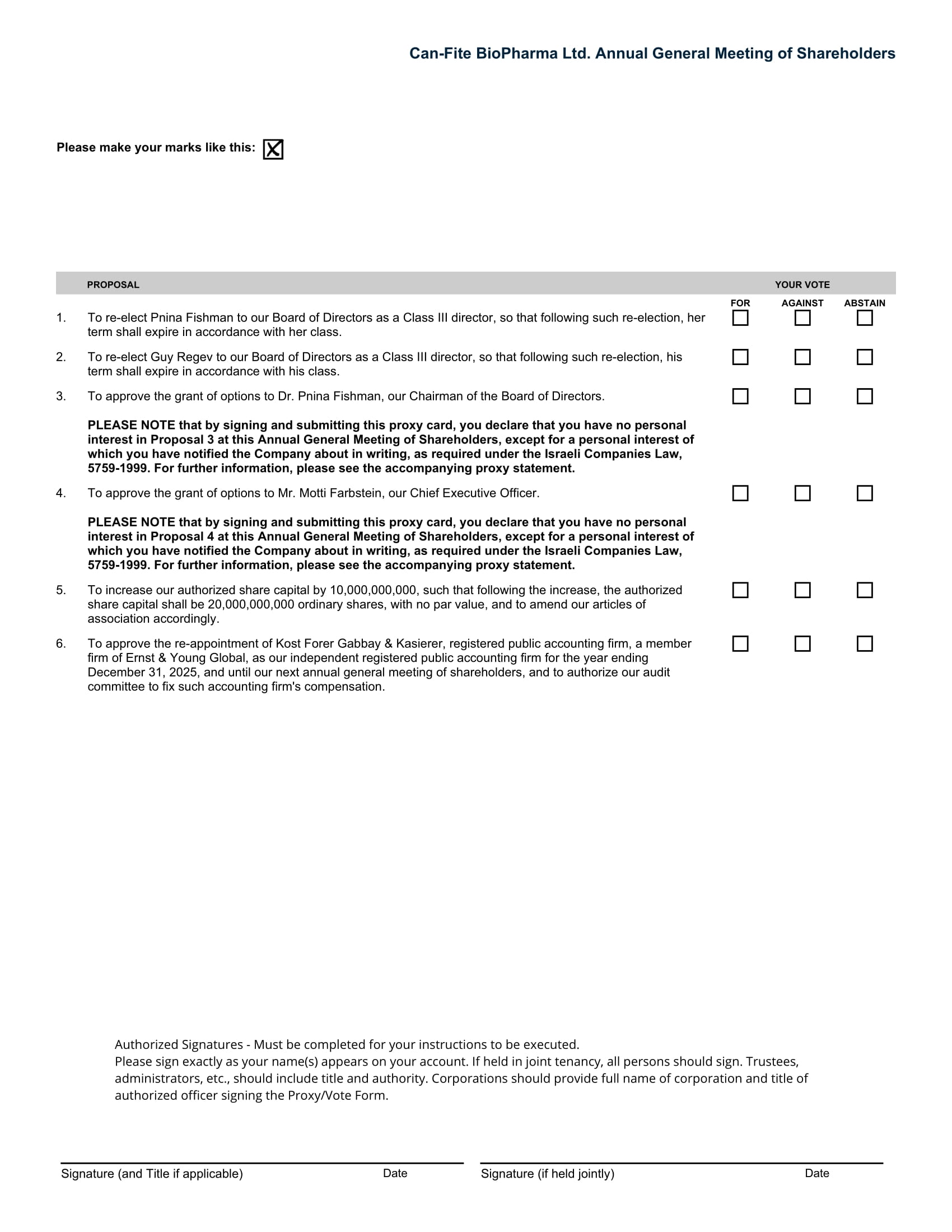 Can - Fite BioPharma Ltd. Annual General Meeting of Shareholders Please make your marks like this: YOUR VOTE PROPOSAL AGAINST ABSTAIN FOR 1. To re - elect Pnina Fishman to our Board of Directors as a Class III director, so that following such re - election, her term shall expire in accordance with her class. 2. To re - elect Guy Regev to our Board of Directors as a Class III director, so that following such re - election, his term shall expire in accordance with his class. 3. To approve the grant of options to Dr. Pnina Fishman, our Chairman of the Board of Directors. PLEASE NOTE that by signing and submitting this proxy card, you declare that you have no personal interest in Proposal 3 at this Annual General Meeting of Shareholders, except for a personal interest of which you have notified the Company about in writing, as required under the Israeli Companies Law, 5759 - 1999. For further information, please see the accompanying proxy statement. 4. To approve the grant of options to Mr. Motti Farbstein, our Chief Executive Officer. PLEASE NOTE that by signing and submitting this proxy card, you declare that you have no personal interest in Proposal 4 at this Annual General Meeting of Shareholders, except for a personal interest of which you have notified the Company about in writing, as required under the Israeli Companies Law, 5759 - 1999. For further information, please see the accompanying proxy statement. 5. To increase our authorized share capital by 10,000,000,000, such that following the increase, the authorized share capital shall be 20,000,000,000 ordinary shares, with no par value, and to amend our articles of association accordingly. 6. To approve the re - appointment of Kost Forer Gabbay & Kasierer, registered public accounting firm, a member firm of Ernst & Young Global, as our independent registered public accounting firm for the year ending December 31, 2025, and until our next annual general meeting of shareholders, and to authorize our audit committee to fix such accounting firm's compensation. Authorized Signatures - Must be completed for your instructions to be executed. Please sign exactly as your name(s) appears on your account. If held in joint tenancy, all persons should sign. Trustees, administrators, etc., should include title and authority. Corporations should provide full name of corporation and title of authorized officer signing the Proxy/Vote Form. Signature (and Title if applicable) Date Date Signature (if held jointly)