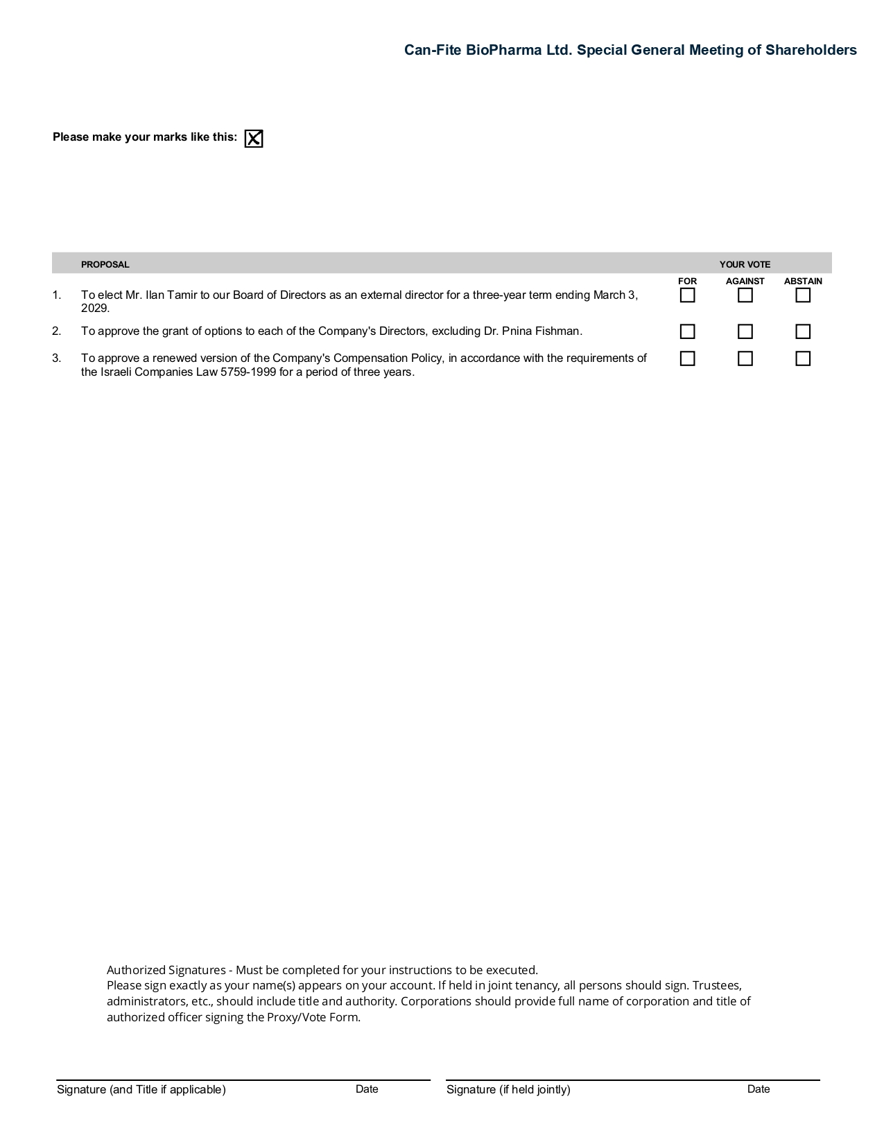 Can - Fite BioPharma Ltd. Special General Meeting of Shareholders Please make your marks like this: YOUR VOTE PROPOSAL AGAINST ABSTAIN FOR 1. To elect Mr. Ilan Tamir to our Board of Directors as an external director for a three - year term ending March 3, 2029. 2. To approve the grant of options to each of the Company's Directors, excluding Dr. Pnina Fishman. 3. To approve a renewed version of the Company's Compensation Policy, in accordance with the requirements of the Israeli Companies Law 5759 - 1999 for a period of three years. Authorized Signatures - Must be completed for your instructions to be executed. Please sign exactly as your name(s) appears on your account. If held in joint tenancy, all persons should sign. Trustees, administrators, etc., should include title and authority. Corporations should provide full name of corporation and title of authorized officer signing the Proxy/Vote Form. Signature (and Title if applicable) Date Date Signature (if held jointly)