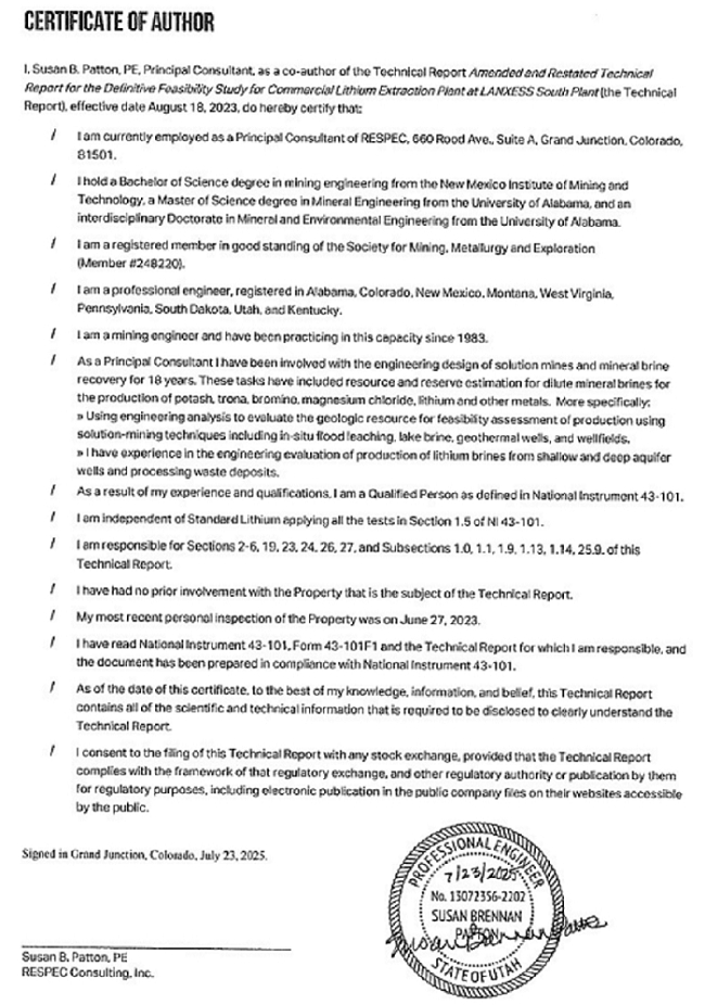 I, Randal M. “Randy” Brush, PE, as a co-author of the Technical Report titled Amended and Restated Technical Report for the Definitive Feasibility Study for Commercial Lithium Extraction Plant at LANXESS South Plant (the Technical Report), effective date August 18, 2023, do hereby certify that: