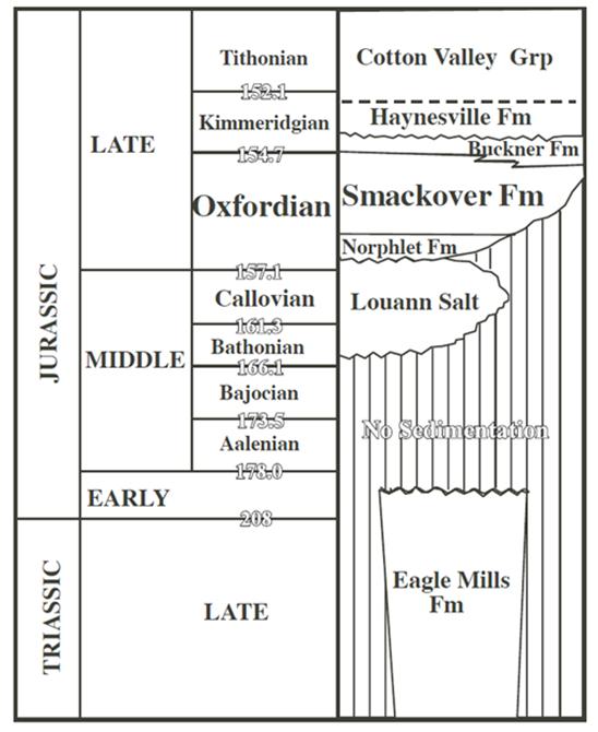 Wade, W.J., and Moore, C.H., 1993. Jurassic sequence stra¬tigraphy of southwest Alabama; Gulf Coast Association of Geological Societies Transactions, v. 43, p. 431–443.