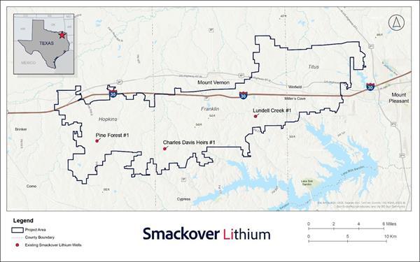 The resource underlies a total of 617 separate brine and brine-sourced mineral leases which are distributed across West Titus, Franklin and East Hopkins Counties in Northeast Texas. The 32,455-hectare (80,199 acres) project area consists of 18,732 gross brine mineral hectares (46,287 gross brine mineral acres) leased by Smackover Lithium.
