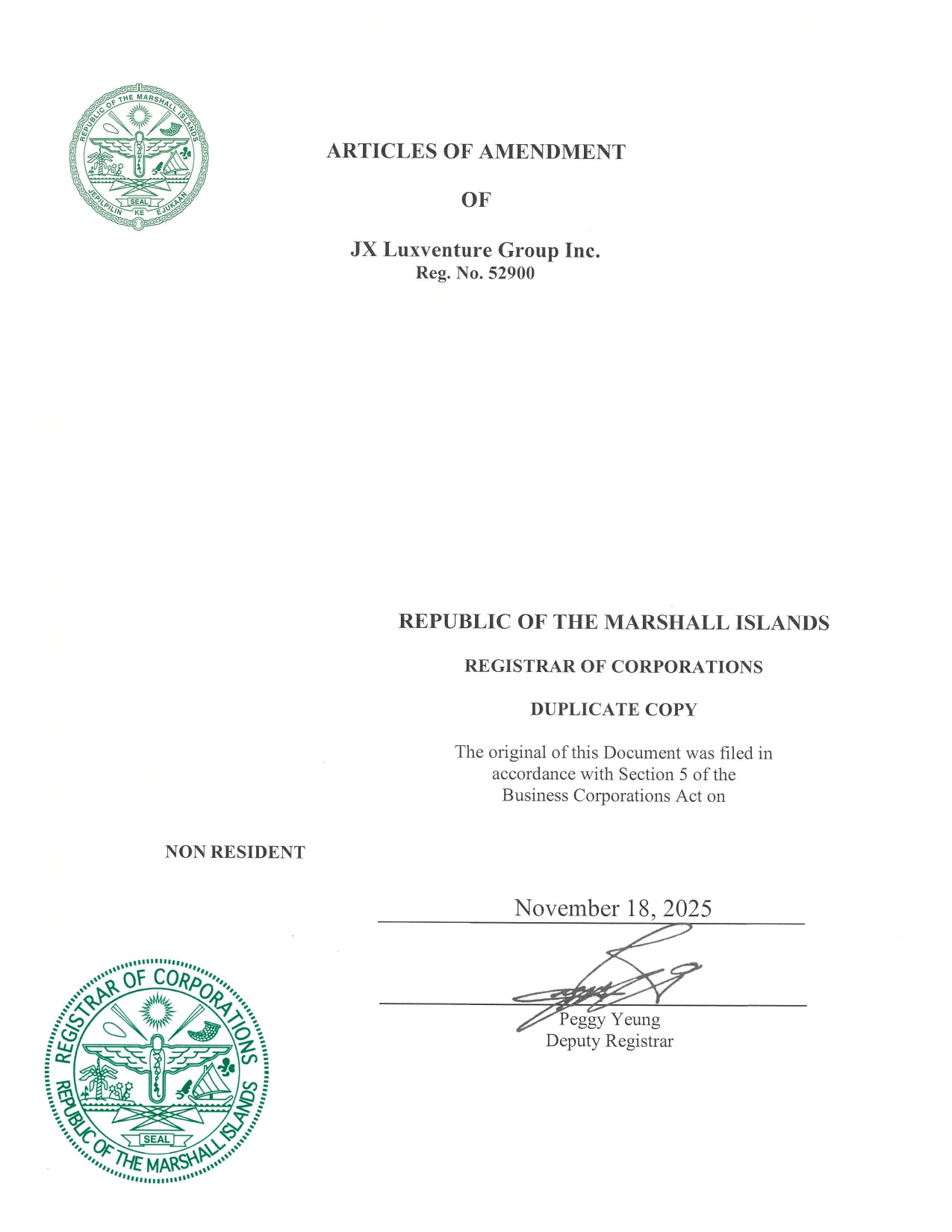 EX-3.1 2 ea026636401ex3-1_jxluxvent.htm ARTICLES OF AMENDMENT TO THE AMENDED AND RESTATED ARTICLES OF INCORPORATION FILED BY THE REGISTRANT ON NOVEMBER 18, 2025