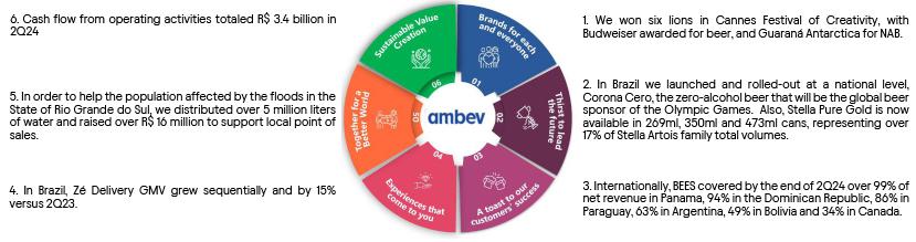 ·Commercial highlights: our premium and super premium brands continued to outperform, growing volumes in the low teens, driven by Corona, Spaten and Original. In the core plus segment, the performance of Budweiser family led to high-teens volumes growth, while core brands remained resilient, delivering a low-single digit increase driven by Brahma and Antarctica. As for our digital initiatives, BEES Marketplace continued to improve, with GMV growing sequentially and by 32% on a year-over-year basis. Zé Delivery kept expanding coverage, generating over 16 million orders (+13% vs. 2Q23).