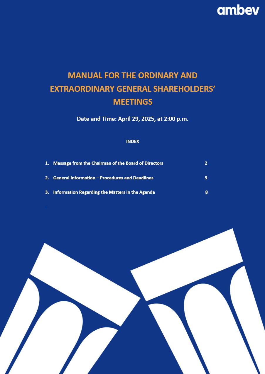 We are delighted to invite you to read our Manual (“Manual”) for the Ordinary and Extraordinary General Shareholders’ Meetings of Ambev S.A. (“Company”) to be held, cumulatively, on April 29, 2025, at 2:00 p.m., in an exclusively digital form, through Ten Meetings digital platform (“Digital Platform”), to be considered held, for the purposes of article 5, § 2, item I, § 3, and article 28, §§ 2 and 3, of the Brazilian Securities Commission (“CVM”) Resolution No. 81, of March 29, 2022 (“CVM Resolution 81/22”), at the Company’s headquarters (“AGOE” or “Shareholders’ Meetings”).